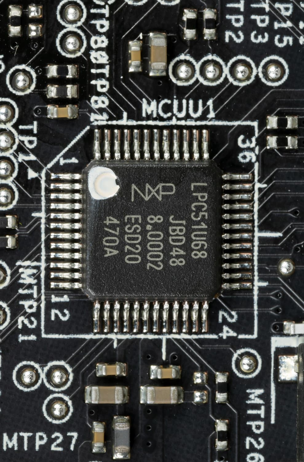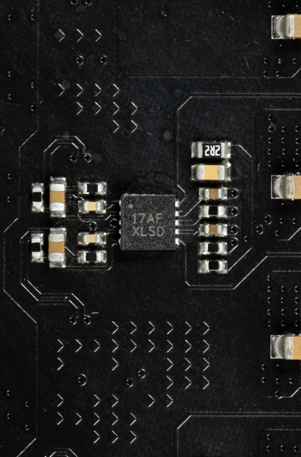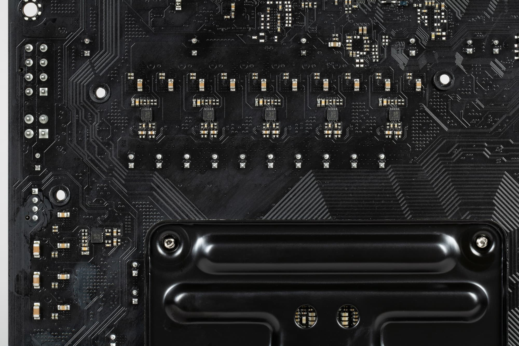 На оборотной стороне из элементов имеется только мелкая логика и удвоители фаз питания. Обработан текстолит стандартно: во всех точках пайки острые концы срезаны. Бэкплейта нет.