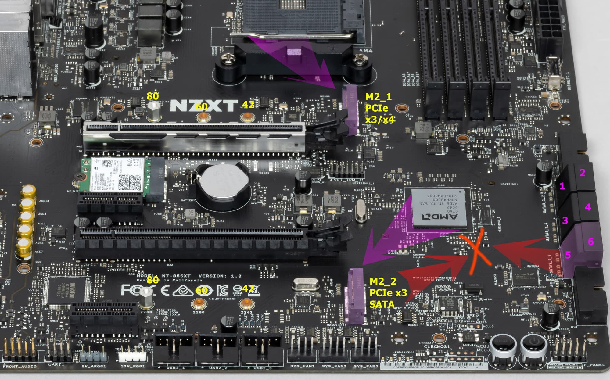 - Переключатель: или порты SATA_5/6 (2 линии), или слот M.2_2 (4 линии): максимум 4 линии;
