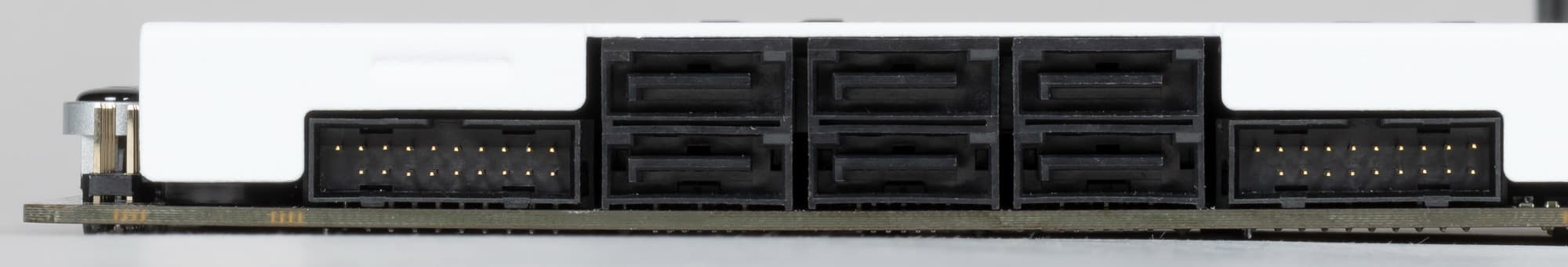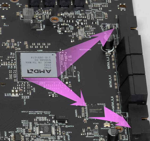 14 линий PCIe оказались занятыми. Замечу особо, что всего у платы 6 портов SATA, а штатно от чипсета распределено всего 4 таких порта. Остальные два порта SATA используют свободные PCIe линии (в данном случае они делятся между портами SATA 5/6 и слотом M.2_2).