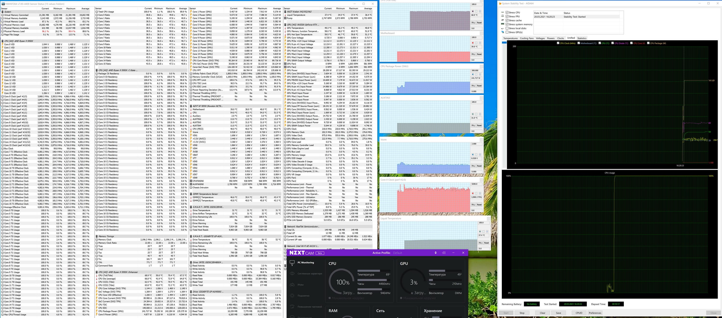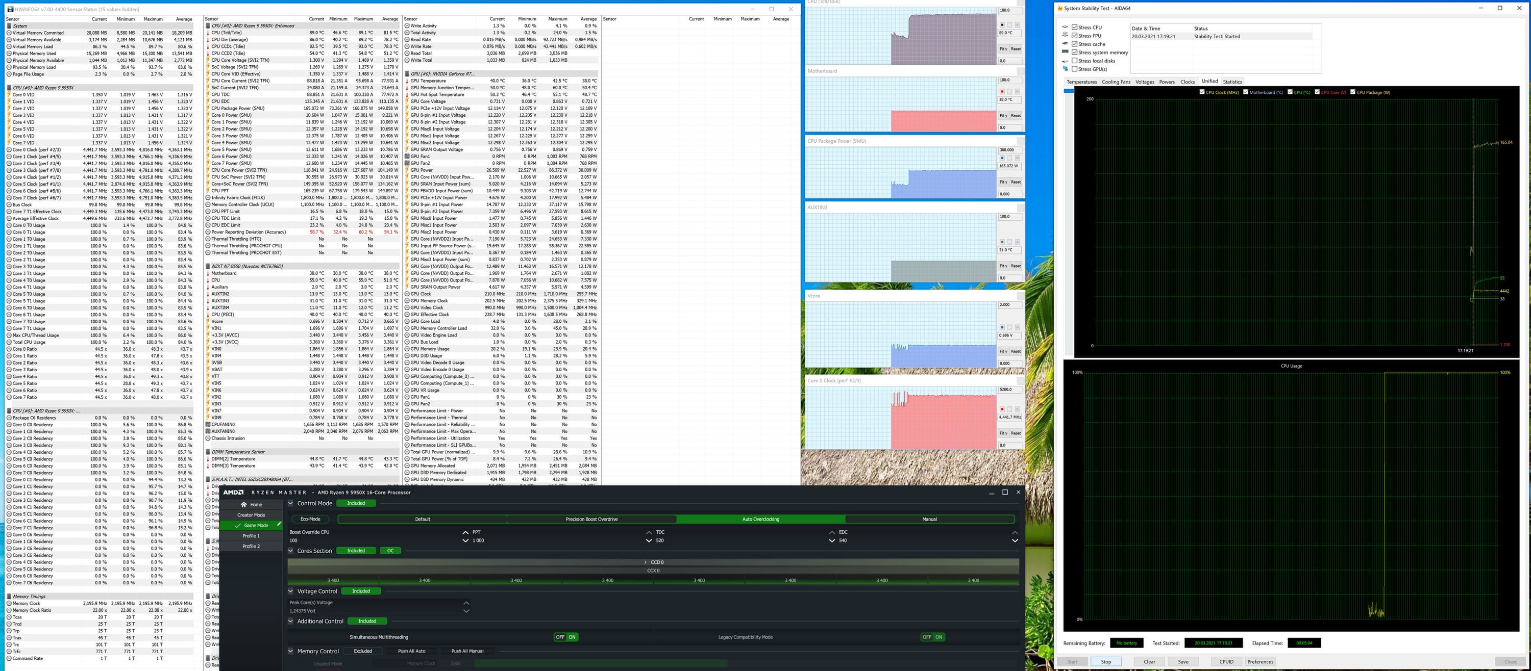 И мы снова видим прекрасный результат, оставшиеся 8 ядер спокойно бегают по частотам 4,5—4,9 ГГц, и тут уже нужно лишь отменное охлаждение, если 5950Х направить на бурную деятельность. Впрочем, в играх сейчас главным действующим лицом является видеокарта, так что CPU не будет так жестко нагружен, как в тестах AIDA, а значит и нагрев в целом будет меньше. Всем геймерам очень рекомендую ставить RM и включать Game Mode.