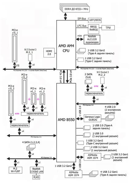 В свою очередь чипсет B550 поддерживает в сумме 18 линий PCIe 3.0. Из них опять же 4 нужны для связи с CPU. Осталось 14 линий ввода-вывода, из которых 4 заняты портами SATA, а остальные 10 линий могут свободно конфигурироваться. Понятно, что скорее всего будет дефицит линий PCIe для размещения всей нужной периферии, и придется делить ресурсы.