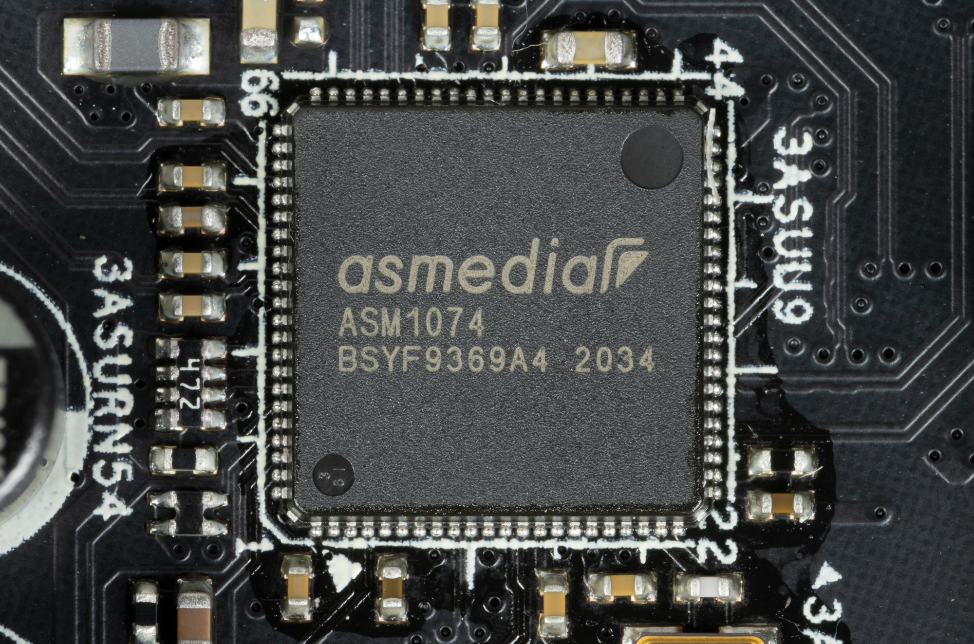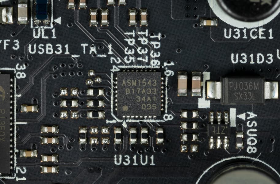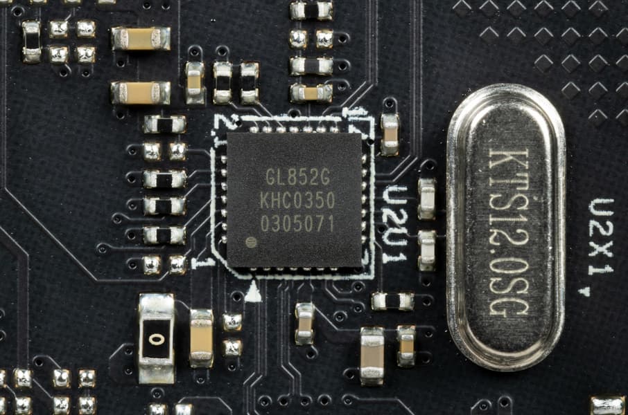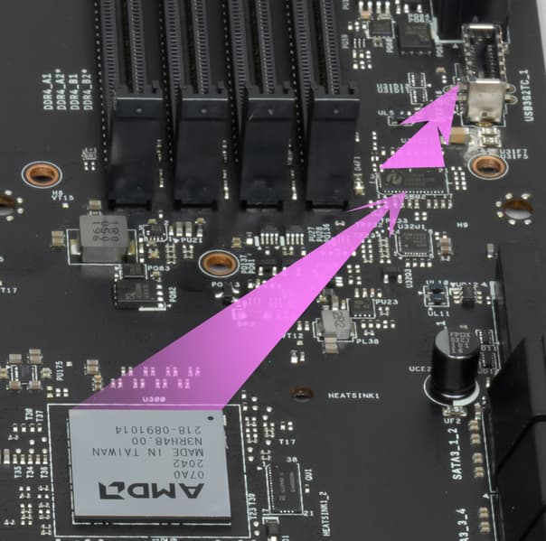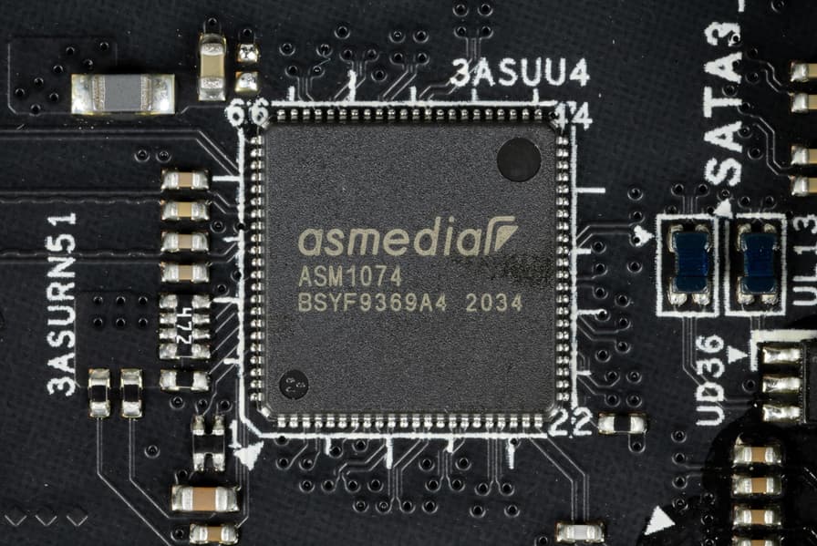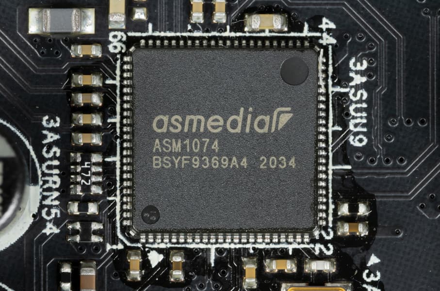 Контроллеры Genesys Logic GL852G (4 USB 2.0 на 2х внутренних разъемах), два ASMedia ASM1074 (6 USB 3.2 Gen1) используют линии портов USB. Подробнее в разделе по USB-портам.
