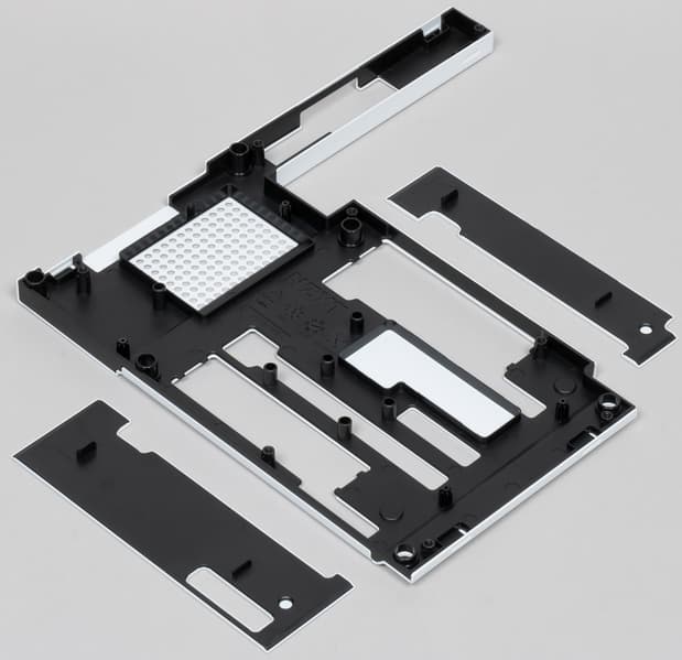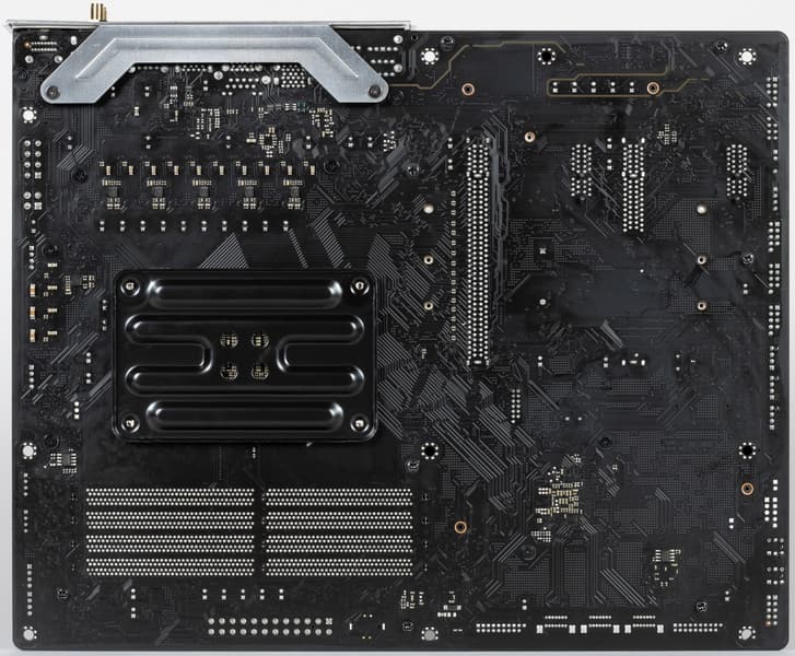 Внутри черное покрытие — точно пластиковое, а вот наружные белые панели — металлические, поэтому у меня лично возник сразу вопрос: почему нельзя было организовать радиаторы охлаждения M.2 накопителей на этих заглушках? Делов-то: сделать их толще в районе M.2 портов и насадить «терможвачку». При этом и дизайн в целом платы только выиграл бы.
