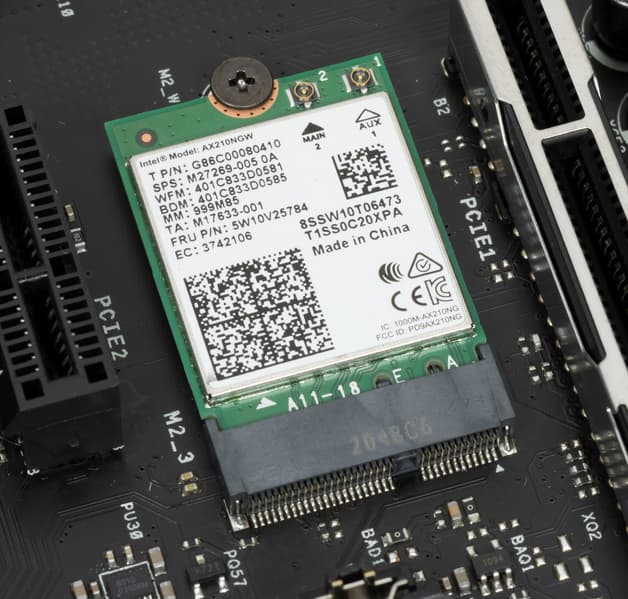 Имеется и комплексный беспроводной адаптер на контроллере Intel AX210NGW, через который реализованы Wi-Fi (802.11a/b/g/n/ac/ax) и Bluetooth 5.2. Он установлен в слот M.2 (E-key), и его разъемы для привинчивания выносных антенн выведены на заднюю панель.
