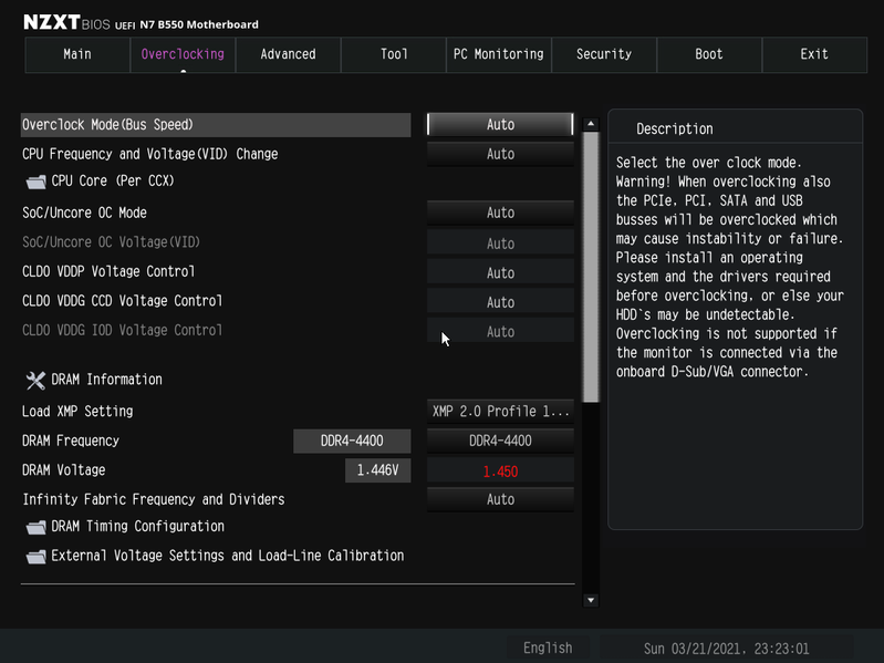 Снова тоже следует повторить, что внутренняя шина процессоров Ryzen — Infinity Fabric (IF) очень чувствительна к разгону, и ранее ее частота не должна была превышать 1800 МГц, а теперь на Ryzen 5000 серии отдельные экземпляры процессоров могут работать и 2000 МГц по этой шине. А IF связана с частотой работы памяти множителями. По умолчанию он равен 1. То есть расчет на частоту работы памяти не выше 3600 МГц. Но уже много памяти на рынке с XMP профилями выше 4000 МГц, и тут все зависит от конкретной модели матплаты: на каких-то надо вручную выставлять частоту IF или памяти, а также множителей, а какие-то модели автоматически выставят частоту IF не выше 1800 МГц вне зависимости от частоты работы памяти с XMP профилем (просто подберут нужный множитель). Данная плата от NZXT способна сама реализовать контроль за частотой IF, держа ее не выше 1800 МГц (разумеется, если она выставлена в режиме Auto) и выставляет множитель для частоты памяти автоматически, что уже хорошо.