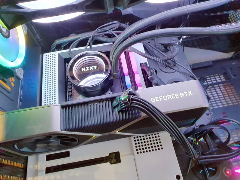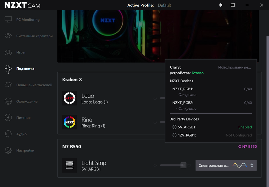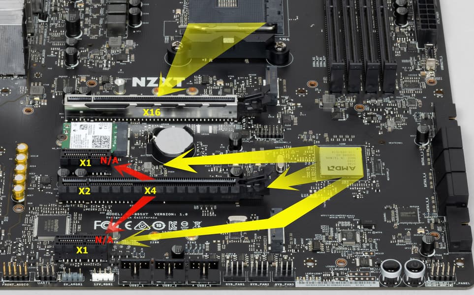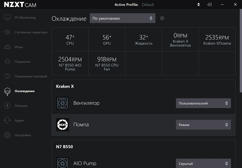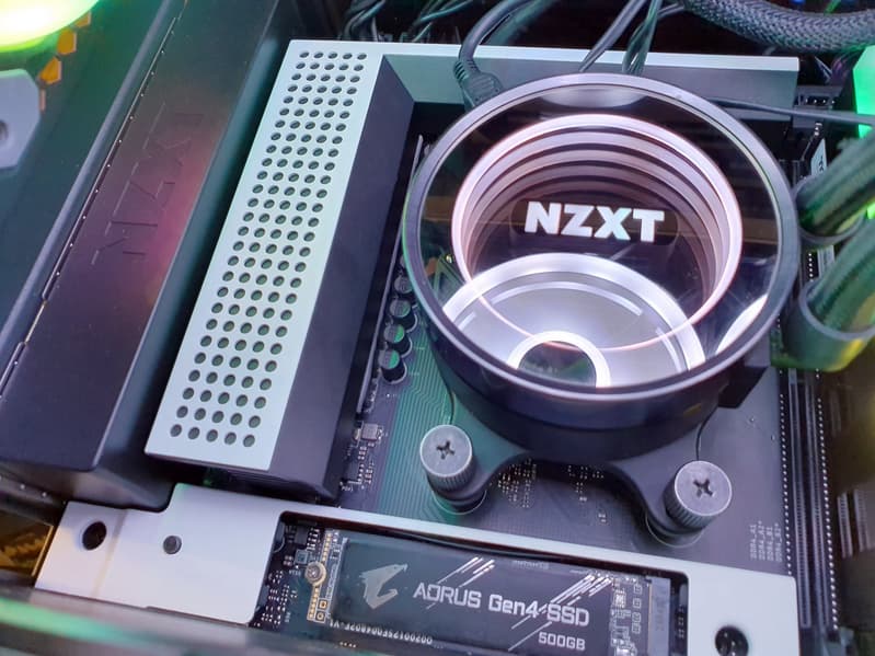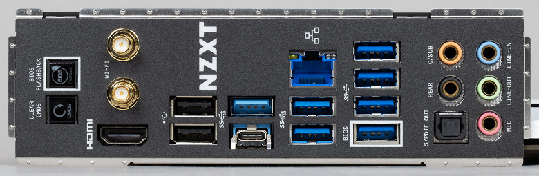 Функциональность у NZXT N7 B550 для своей ниши прекрасная. Плата имеет аж 21 (!) порт USB разных видов (включая 5 (пять!) USB 3.2 Gen2), 2 слота PCIe х16 (из которых первый получает 16 линий PCIe от процессора) с возможностью объединения видеокарт в AMD CrossFire, 2 слота PCIe x1 для карт расширения, 2 слота M.2, 6 портов SATA, 7 разъемов для подключения вентиляторов и помп. Есть как высокоскоростной проводной 2,5-гигабитный контроллер, так и современный беспроводной с поддержкой Wi-Fi 6 и Bluetooth 5.2. Можно подключать ARGB/RGB-устройства для управления подсветкой. Сама плата на радость определенной категории пользователей подсветки не имеет.