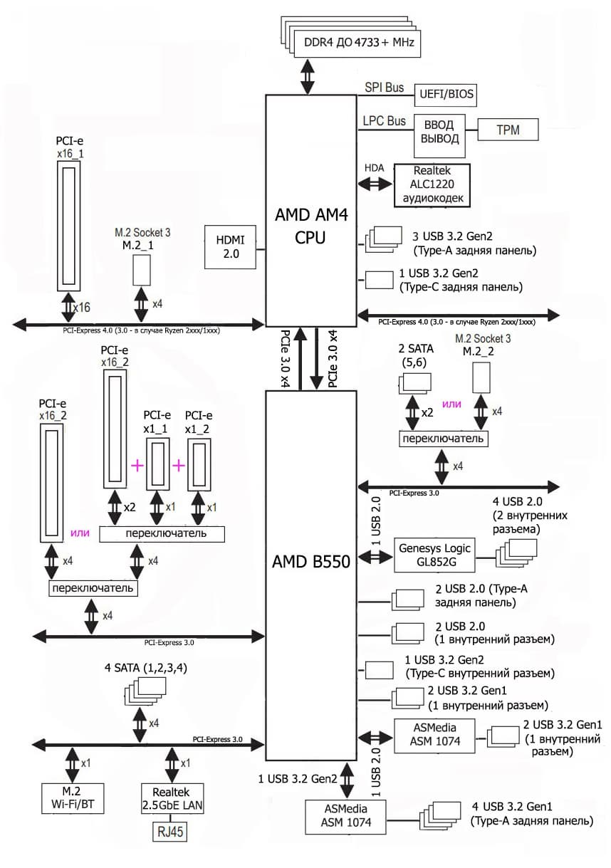 Процессоры Ryzen 3000/5000 суммарно имеют 24 линии ввода-вывода (включая PCIe 4.0). 4 линии (в данном случае превращаясь в PCIe 3.0) идут на связь с чипсетом B550. Еще 16 линий — это PCIe слоты для видеокарт. Осталось 4 линии: они могут конфигурироваться производителями материнских плат на выбор (либо-либо):