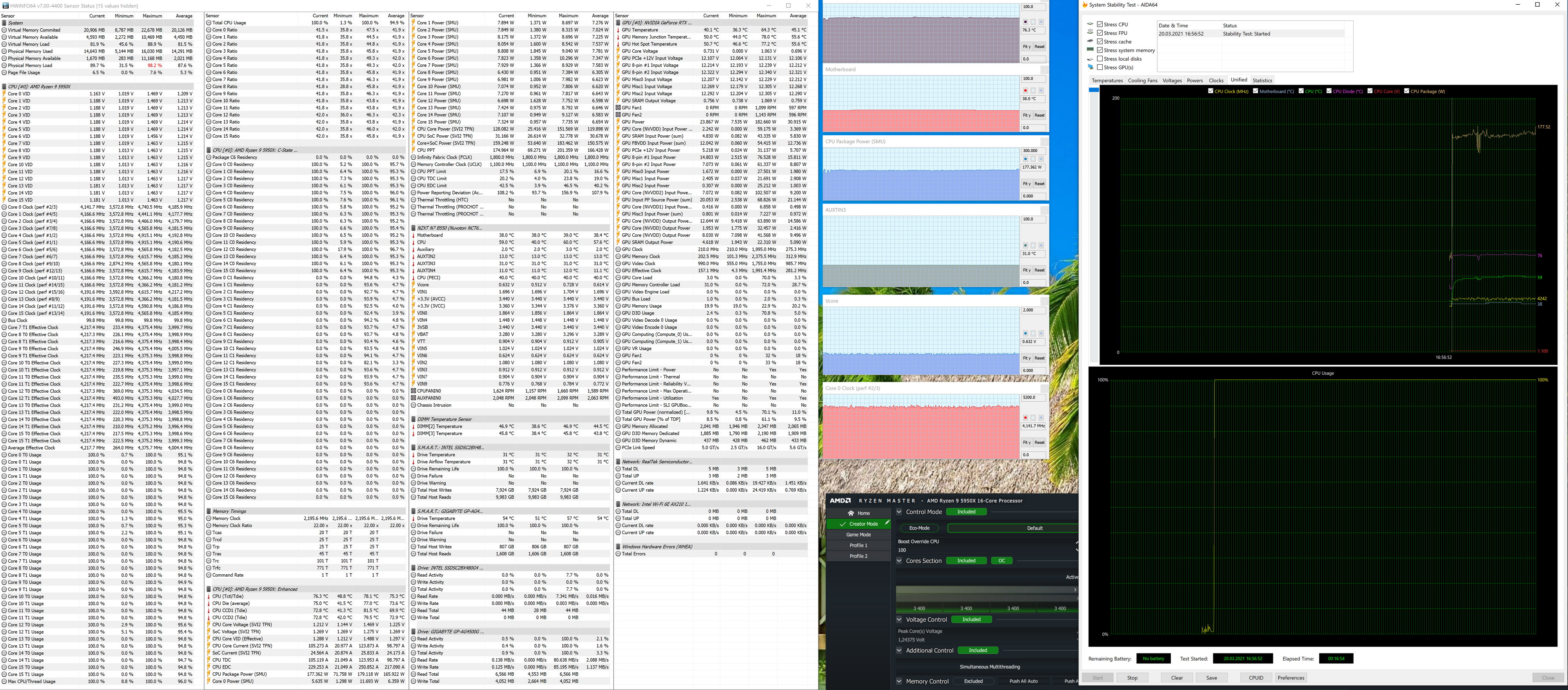 Учитывая, что у этой платы добротная система питания, я снова взял самый топовый на сегодня процессор (спасибо компании AMD за сэмпл) Ryzen 9 5950X, чтобы проверить работу системы питания материнки. К тому же, я уже ранее писал, что платы такого рода весьма годны для флагманского процессора. Хорошо известно, что современные технологии авторазгона от Intel (Turbo Boost) и AMD (Precision Boost) базируют свои лимиты подъема частот на информации о системе питания на той или иной матплате (для того и существуют цифровые контроллеры, а также UEFI, где собрана вся информация о них, плюс постоянный мониторинг).