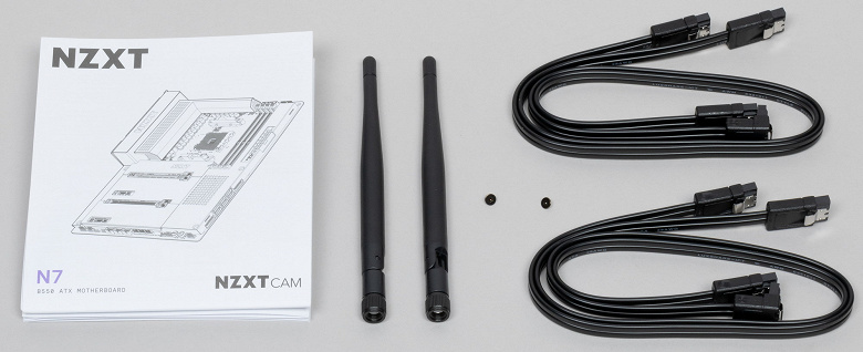 Комплект поставки минимален. Кроме традиционных элементов типа руководства пользователя и кабелей SATA (что уже много лет является обязательным набором ко всем материнкам), имеются: винтики для монтажа модулей M.2 и антенны для беспроводной связи.