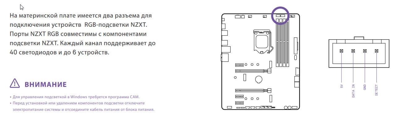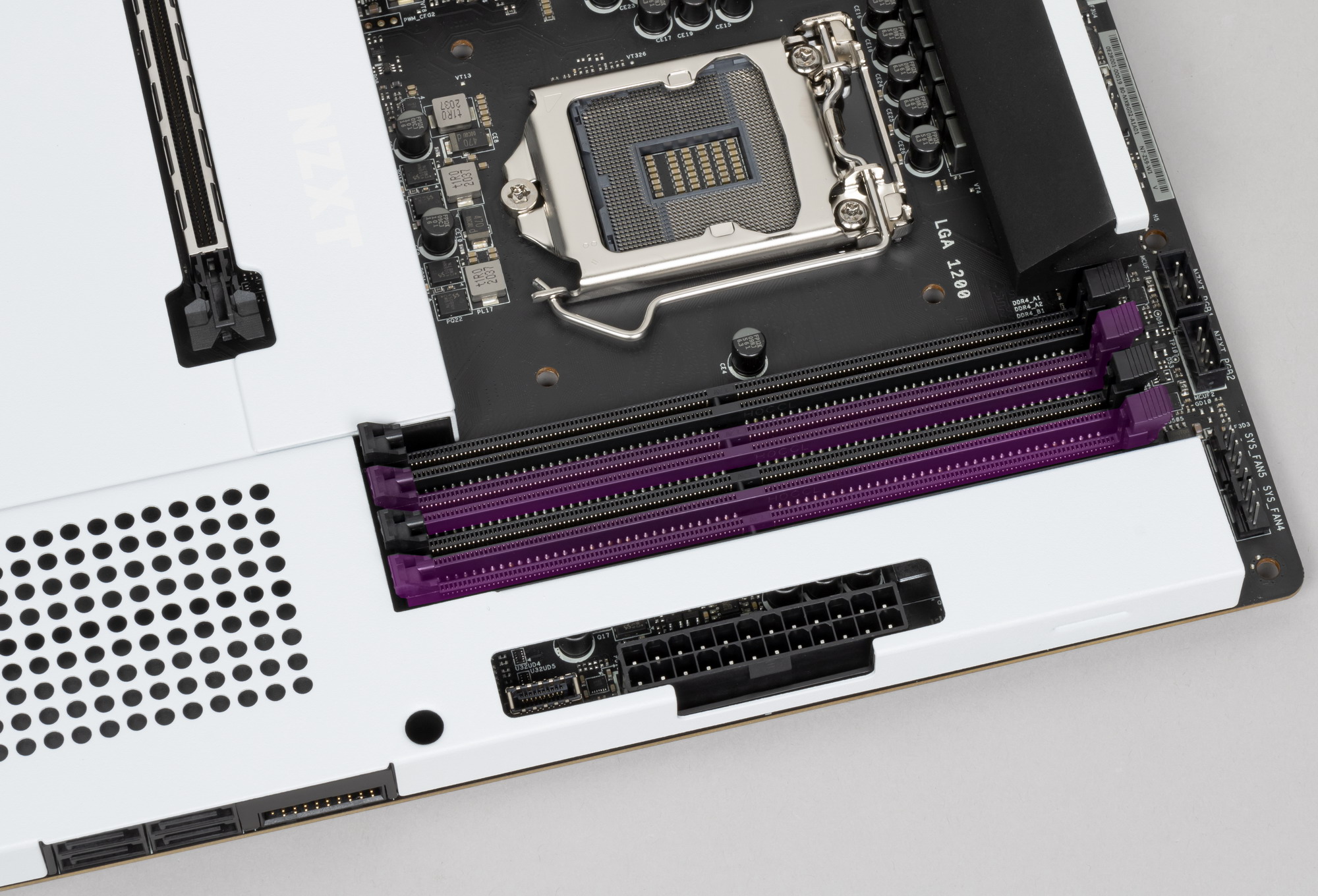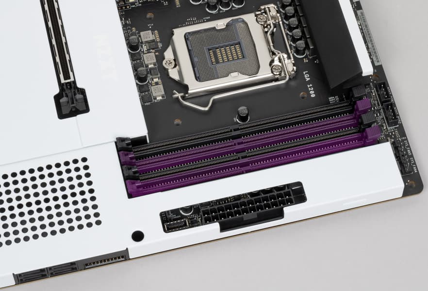 Для установки модулей памяти на плате NZXT имеется четыре DIMM-слота (для работы памяти в Dual Channel в случае использования всего 2 модулей их следует устанавливать в А2 и B2. Плата поддерживает небуферизованную память DDR4 (non-EСС), а максимальный объем памяти составляет 128 ГБ (при использовании UDIMM последнего поколения по 32 ГБ). Поддерживаются профили XMP.