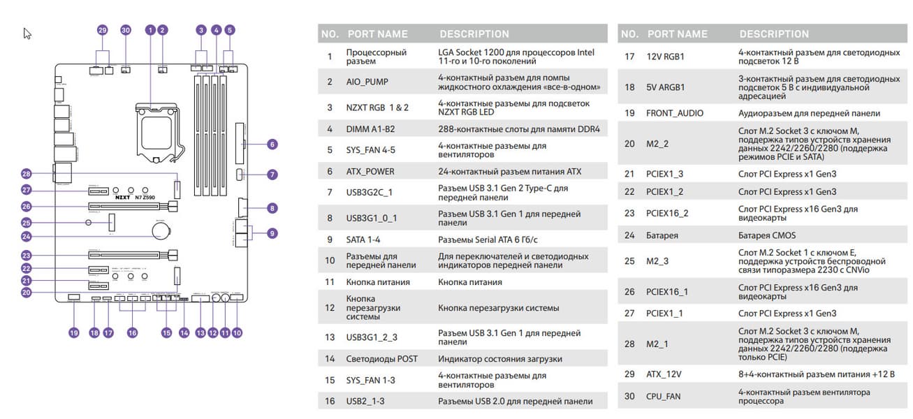 | Прочие внутренние элементы | 24-контактный разъем питания ATX 1 8-контактный разъем питания EPS12V 1 4-контактный разъем питания EPS12V 1 разъем для подключения порта USB 3.2 Gen2 Type-C 2 разъема для подключения 4 портов USB 3.2 Gen1 3 разъема для подключения 6 портов USB 2.0 7 разъемов для подключения 4-контактных вентиляторов и помп ЖСО 1 разъем для подключения неадресуемой RGB-ленты 1 разъем для подключения адресуемой ARGB-ленты 2 разъема для подключения проприетарной NZXT подсветки 1 разъем аудио для передней панели корпуса 1 разъем TPM 2 разъема для подключения управления с передней панели корпуса 1 разъем сброса CMOS |