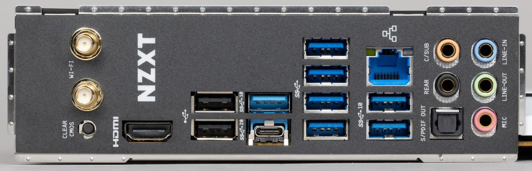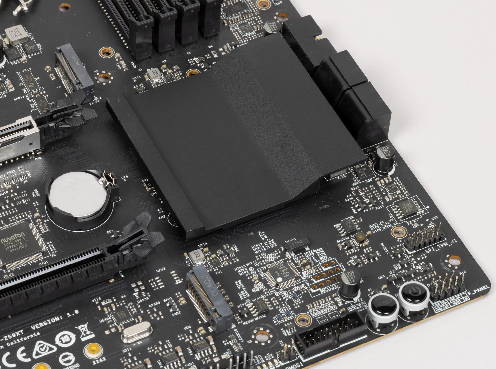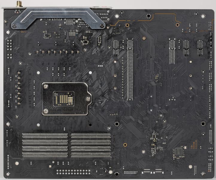 Форм-фактор ATX имеет размеры до 305×244 мм, а E-ATX — до 305×330 мм. Материнская плата NZXT N7 Z590 имеет размеры 305×244 мм, поэтому выполнена в форм-факторе ATX, и на ней имеются 10 монтажных отверстий для установки в корпус (прошу заметить, что только один известный производитель матплат — ASRock обычно делает не 9, а 10 монтажных отверствий на своих платах: это первый явный намек на то, у кого NZXT заказывает свои материнки). Печатная плата имеет 6 слоев.
