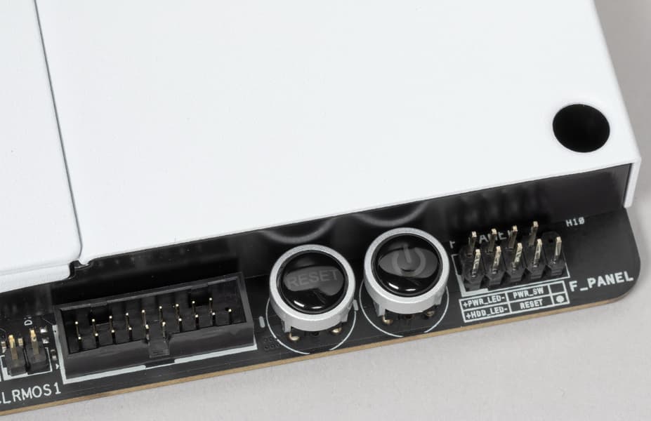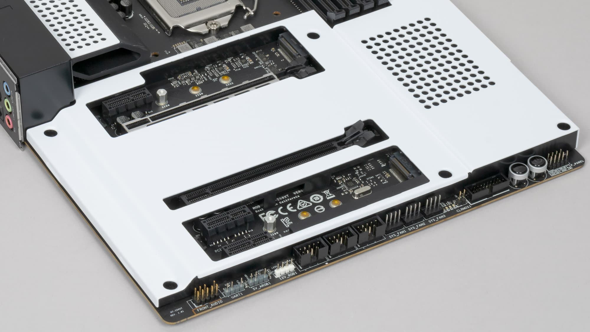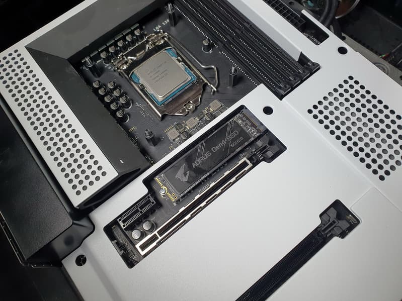 Оба M.2 слота не имеют охлаждения, просто прикрываются декоративным белыми крышками (они имеют внутреннее покрытие из пластика). На мой взгляд — совершенно глупое и непродуманное решение, ибо сейчас все современные очень быстрые NVMe накопители с PCIe 4.0 сильно греются, и, во-первых, все равно придется снимать всю эту декорацию и портить дизайнерское решение ради установки радиаторов на М.2 накопители, во-вторых, инженеры NZXT могли бы в эти самые декоративные крышки вписать нормальные радиаторы охлаждения.