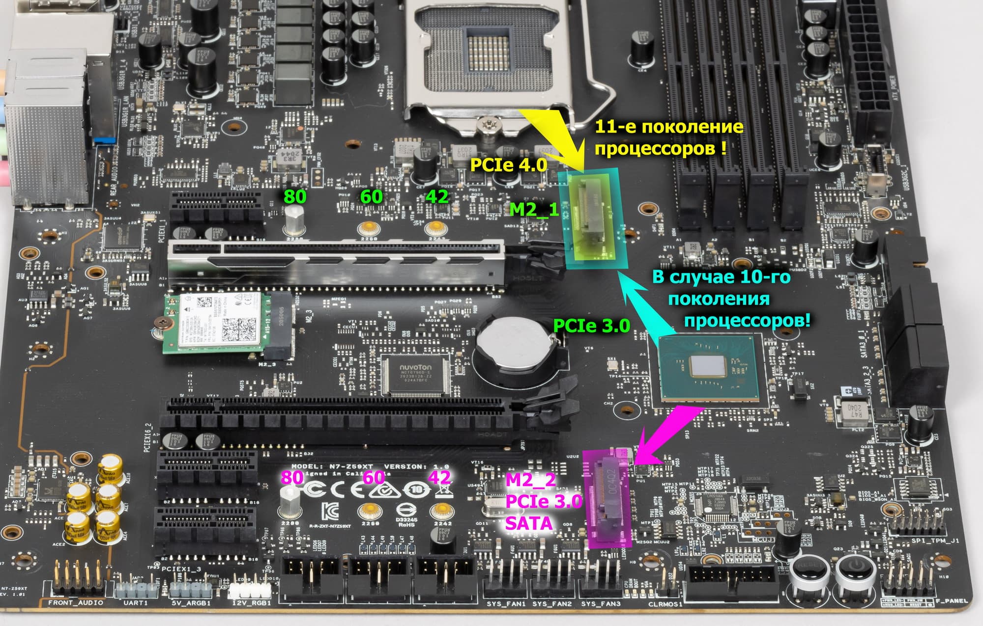 Слот M2_2 поддерживает модули с любым интерфейсом, а M2_1 — только с PCIe интерфейсом. И если M2_2 получает данные от чипсета Z590 (его можно использовать для Intel Optane Memory), то М2_1 работает иначе: в случае использования 11го поколения процессоров он получает данные напрямую от CPU (и поддерживает PCIe 4.0), а в случае 10-го поколения, то от Z590 (и поддерживает PCIe 3.0). Оба М.2 слота поддерживают модули длиной до 2280.