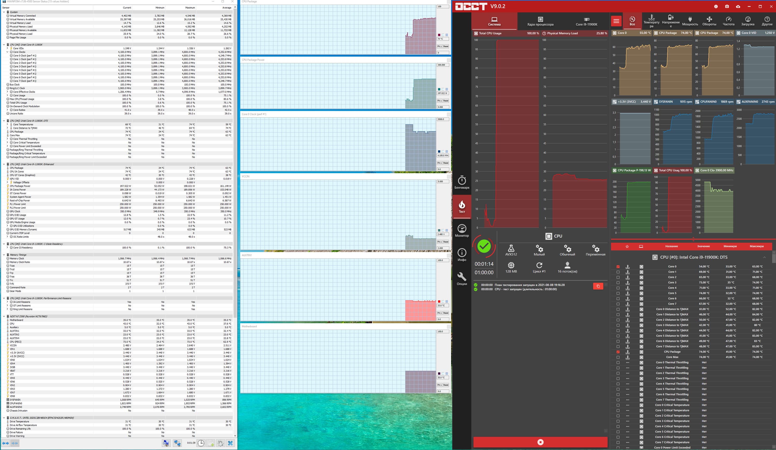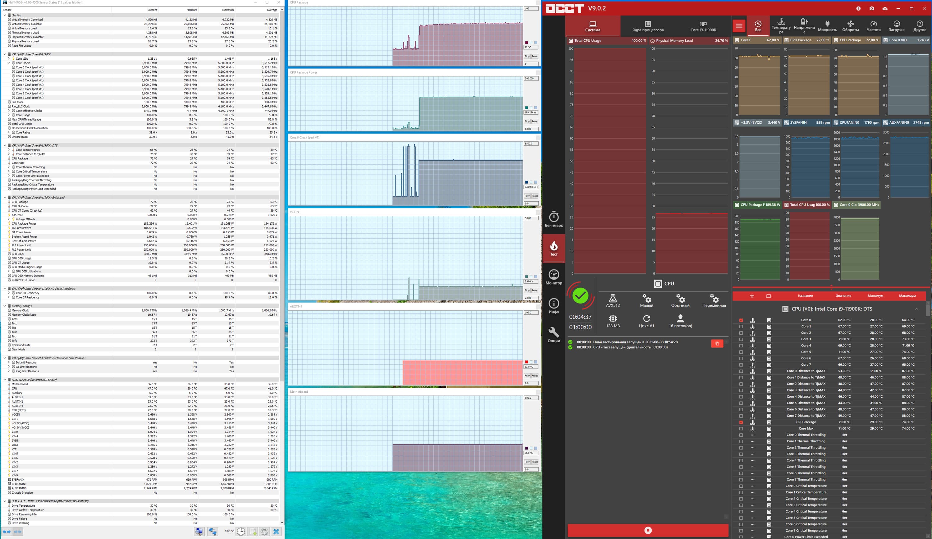 Запускаем все в режиме по умолчанию (Intel Adaptive TurboBoost включено!). При этом МСЕ работает, PL1 отключен, падения потребления нет. Но, как мы видим, частоты повышены крайне мало, 3,9 ГГц — это ни о чем, учитывая близость к базовым значениям. Но при этом одинаковая частота по всем ядрам: МСЕ активно. Не так давно я изучал матплату от ASRock с точно такой же системой питания (впрочем, уже всем должно быть понятно, что и данную материнку NZXT заказывает у ASRock), там разгон по умолчанию был выше 4,4 ГГц. Почему такое? — Вопрос к инженерам NZXT.
