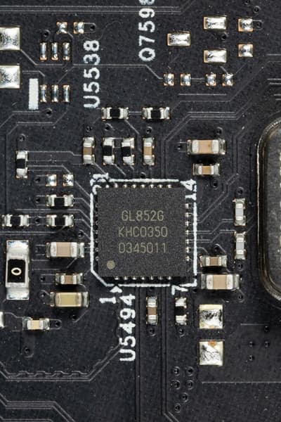 - 8 портов USB 2.0/1.1: 4 реализованы через контроллер Genesys Logic GL852G (на него потрачена линия USB 2.0 от Z590) и представлены двумя внутренними разъемами (каждый на 2 порта); остальные 4 реализованы через Z590, из которых 2 представлены портами Type-A на задней панели (черные) и еще 2 представлены третьим внутренним разъемом (на 2 порта) .