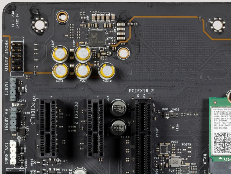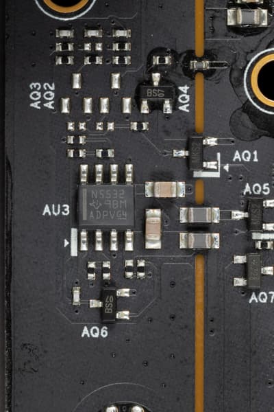 Аудиотракт вынесен на угловую часть платы, не пересекается с другими элементами. Разумеется, левый и правый каналы разведены по разным слоям печатной платы. Все аудиоразъемы на задней панели имеют привычную цветовую окраску разъемов (которая неплохо помогает подключать нужные штекеры без вглядывания в их наименование).