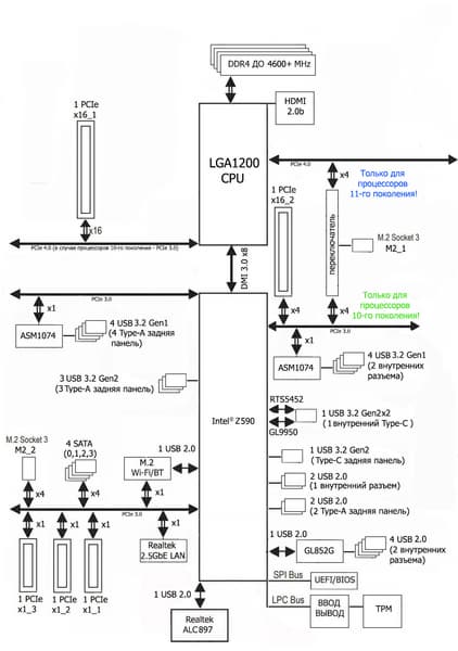 Процессоры Intel Core 11-го поколения (совместимые с сокетом LGA1200 и поддерживаемые Z590) имеют 20 линий ввода-вывода PCIe 4.0, не имеют USB и SATA портов. При этом взаимодействие с Z590 идет по особому каналу Digital Media Interface 3.0 (DMI 3.0), который в Z590 ускорен в 2 раза. Все PCIe линии процессора идут на слоты расширения PCIe и порт М.2. Serial Peripheral Interface (SPI) используется для взаимодействия с системой UEFI/BIOS, а шина Low Pin Count (LPC) — для связи с устройствами ввода/вывода, не требующими высокой пропускной способности (контроллерами вентиляторов, TPM, старой периферии). Процессоры Intel Core 10-го поколения (совместимые с сокетом LGA1200 и поддерживаемые Z490/590) имеют 16 линий ввода-вывода PCIe 3.0, которые идут только на слоты расширения PCIe.