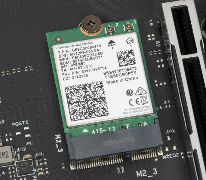 Имеется и комплексный беспроводной адаптер на контроллере Intel AX-210NGW, через который реализованы Wi-Fi 6E (802.11a/b/g/n/ac/ax) и Bluetooth 5.2. Он установлен в слот M.2 (E-key), и его разъемы для привинчивания выносных антенн выведены на заднюю панель.
