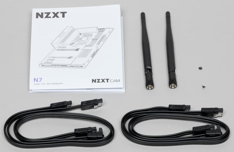 Комплект поставки минимален. Кроме традиционных элементов типа руководства пользователя и кабелей SATA (что уже много лет является обязательным набором ко всем материнкам), имеются: винтики для монтажа модулей M.2 и антенны для беспроводной связи.