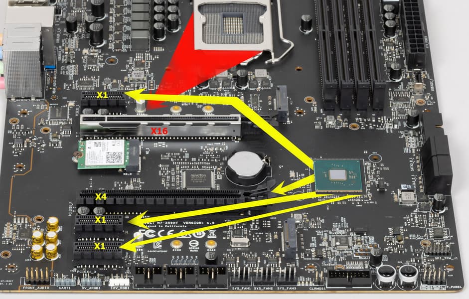 Всего на плате есть 5 слотов PCIe: два PCIe x16 (для видеокарт или других устройств) и три «коротких» PCIe x1. Про первый PCIe x16 я выше уже рассказал (он подключен к CPU), а третий PCIe x16_2 (на деле он имеет всего 4 линии PCIe) подключен к Z590.