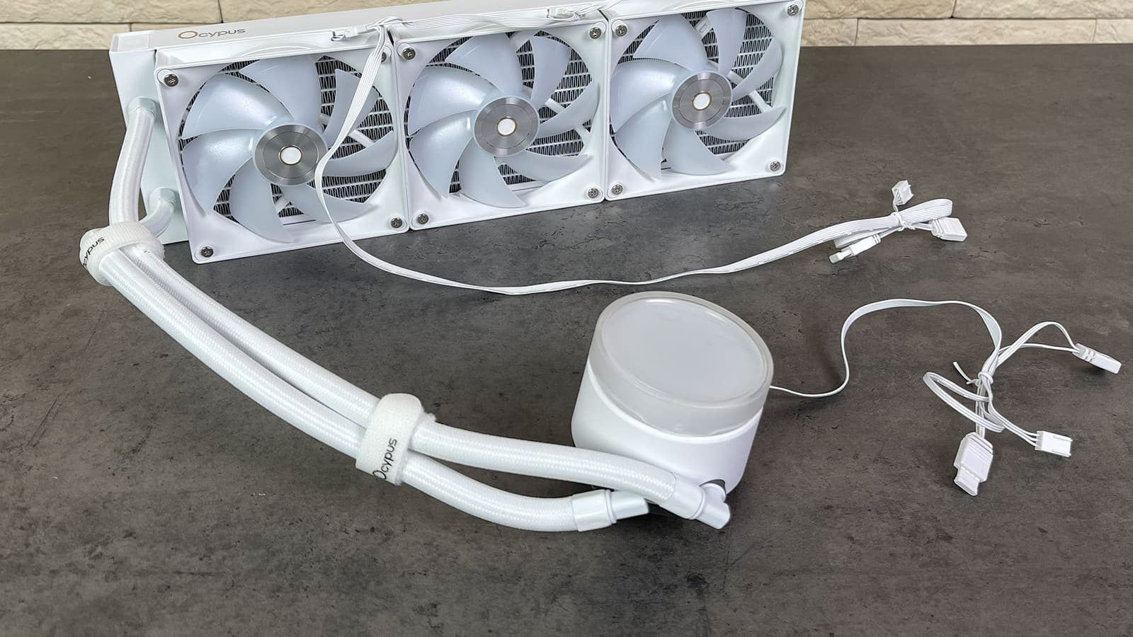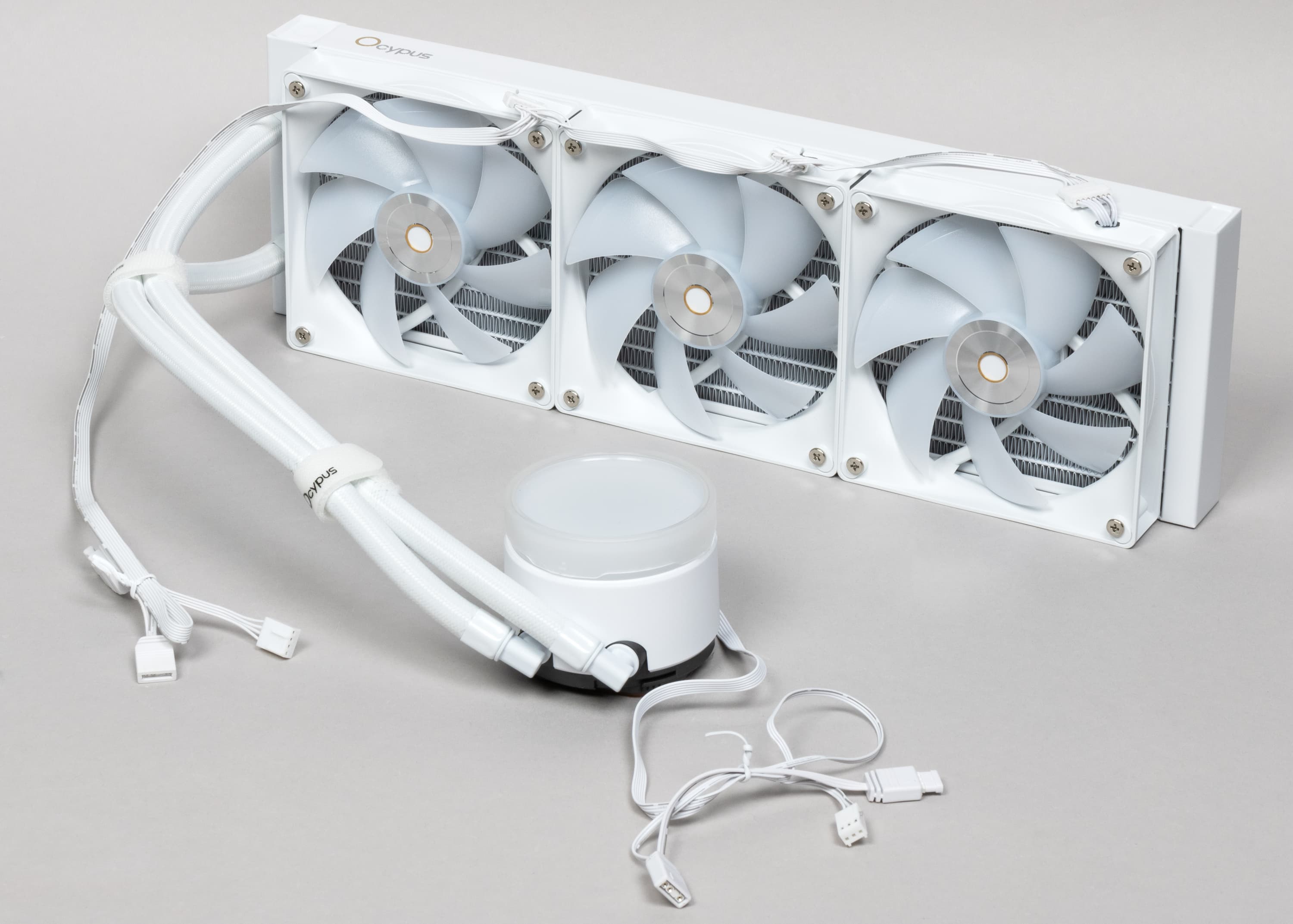 Фактически это те же вентиляторы Ocypus Delta F12, с которыми мы уже знакомы по башенному кулеру Delta A40, но в СЖО и воздушных охладителях компания использует разные профили управления вращением. Кроме того, поменялась схема подключения — оно теперь сквозное единым кабелем питания и подсветки со специфическими разъемами, а первый вентилятор подключается к системе удлинителем-раздвоителем, длиной 65 + 10 см. Выглядит всё очень аккуратно, но если вдруг понадобится замена вентиляторов, то красота будет разрушена.