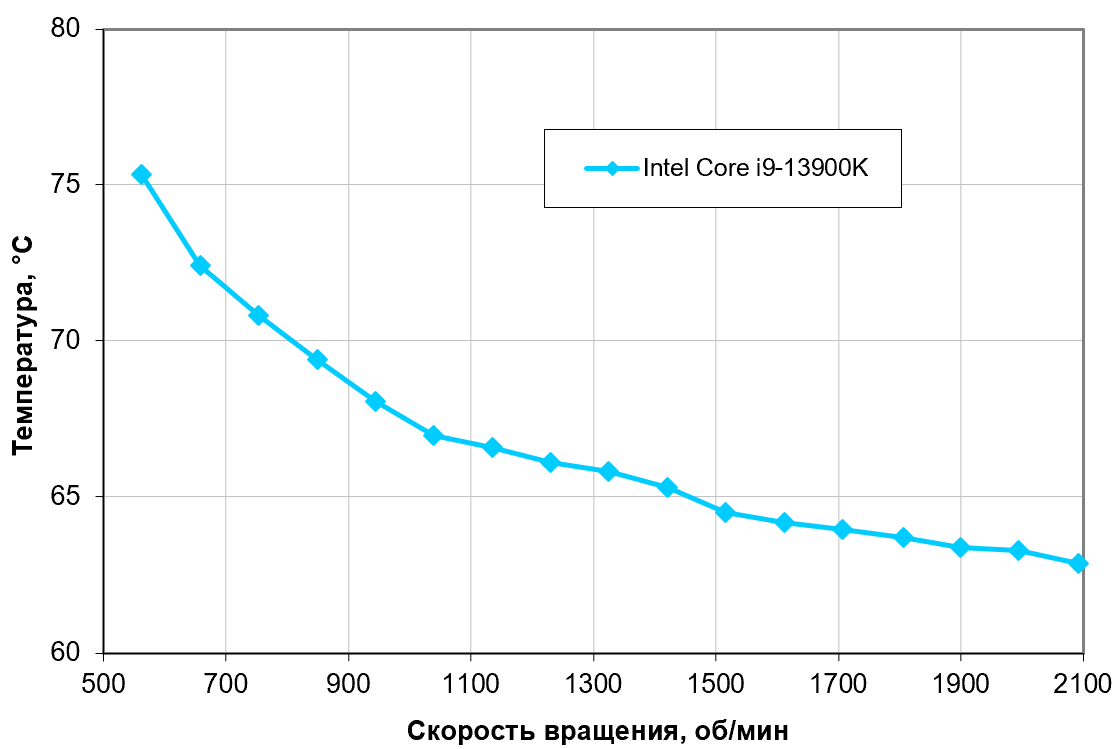 В этом тесте процессор Intel Core i9-13900K не перегревается (при 24 °C окружающего воздуха) на оборотах вентиляторов, достигаемых при снижении КЗ до 20%, что соответствует примерно 562 об/мин. При этом максимальное потребление по данным мониторинга составило порядка 245 Вт, а по разъемам для питания процессора — 282 Вт. Напомним, что базовая мощность этого процессора в полностью штатном режиме составляет всего 125 Вт, а максимальная кратковременная (турбо-лимит) — 253 Вт.