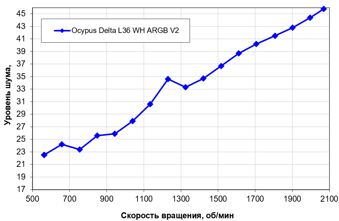 В целом результаты соответствуют другим трех- и даже двухсекционным моделям — например, Ocypus Iota L24 BK в наших тестах смогла достичь немного большего. Но смущаться последнего не стоит, поскольку идеальной точности в этом классе оборудования не бывает — производственные допуски делают каждый экземпляр немного уникальным. Кому-то везет чуть-чуть больше, кому-то — немного меньше, что обязательно стоит помнить, изучая сравнения кулеров перед покупкой. Корректнее говорить не о точных цифрах, а о попадании в определенный диапазон. И вот он у Ocypus Delta L36 ARGB WH V2, повторим, тот же, что и у других СЖО. Что особенно интересно на фоне невысокой цены этой системы, малоотличимой от цен топовых воздушных кулеров даже из ассортимента самой Ocypus (а в целом по рынку бывает и в пару раз дороже).