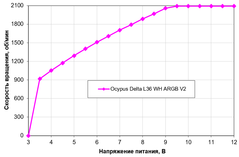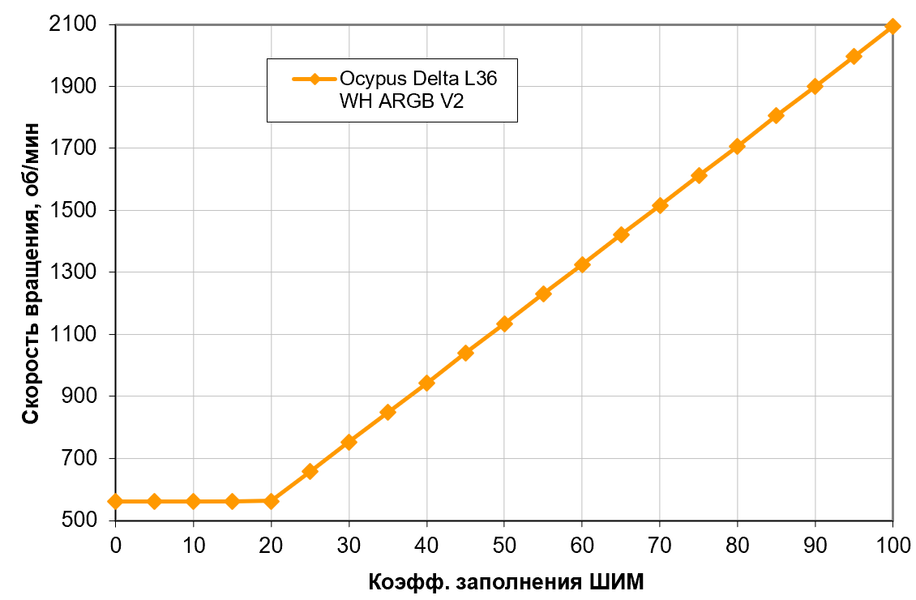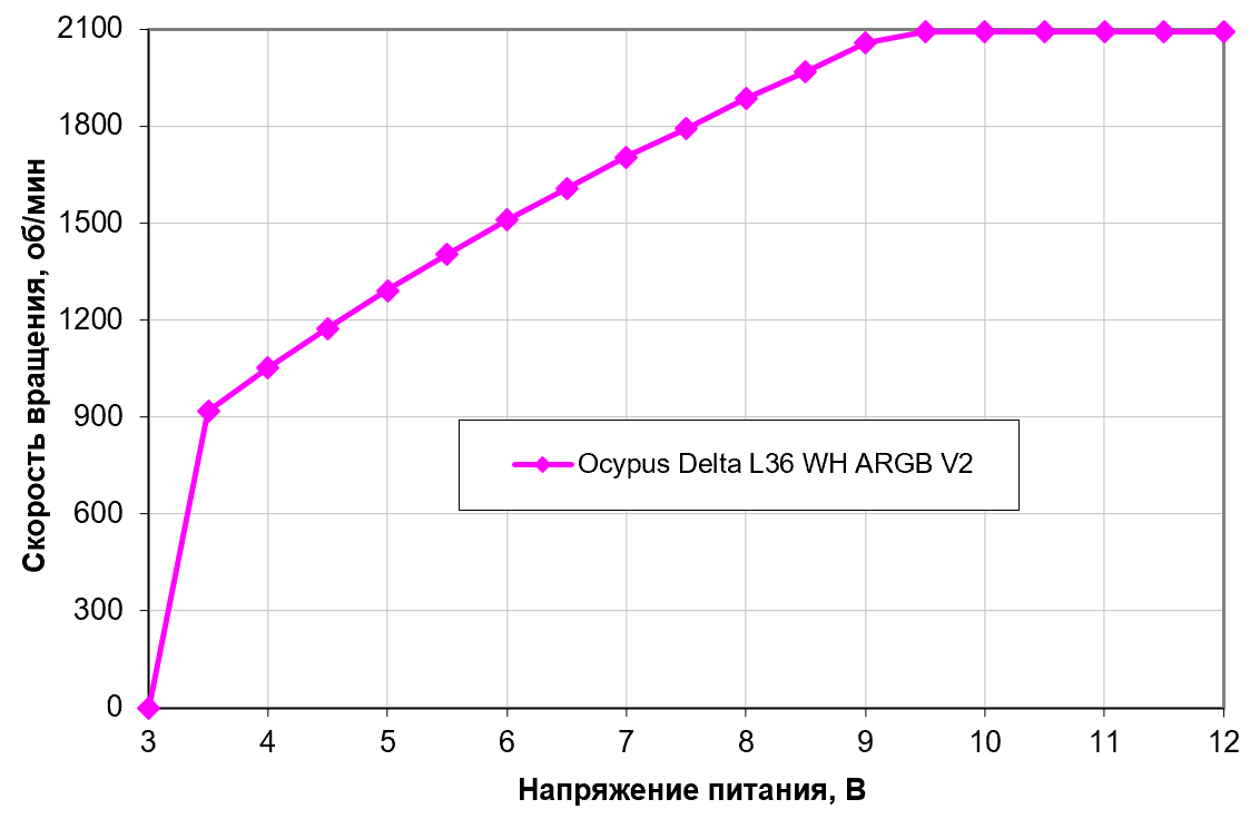 Как уже сказано, в кулерах Ocypus вентиляторы для СЖО и «воздуха» с одинаковыми названиями различаются не только длиной кабеля питания. Последние снижают скорость чуть быстрее и при коэффициенте заполнения (КЗ) 20% стабилизируются примерно на 400 об/мин, а первые останавливают процесс на 550 об/мин. Но в целом результат и там, и там хороший — монотонный рост скорости вращения в широком диапазоне регулировки скорости вращения. В целом поведение Delta F12 этой модификации типично для вентиляторов большинства СЖО: ниже 500+ об/мин они тоже не опускаются, обеспечивая на этом уровне достаточный воздушный поток для минимальной вентиляции корпуса. Если же для решения этой задачи будут использоваться прочие корпусные вентиляторы, эти можно и остановить — для чего придется прибегнуть к снижению напряжения.