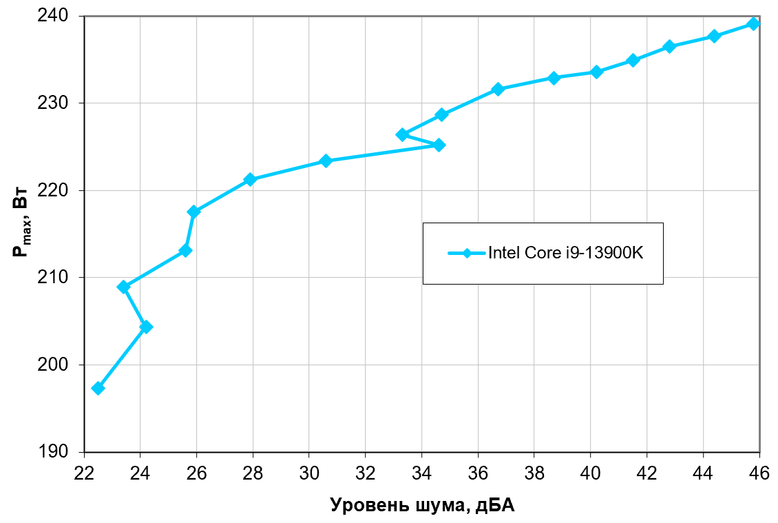 Приняв 25 дБА за критерий условной бесшумности, получим примерную максимальную мощность процессоров, соответствующих этому уровню. Безо всяких натяжек это 212 Вт для процессора Intel Core i9-13900K и ему подобных). Если не обращать внимания на уровень шума в разумных пределах, то потолок мощности можно увеличить примерно до 230 Вт, а в неразумных — и до 240. Еще раз уточним, это в жестких условиях обдува радиатора нагретым до 44 градусов воздухом. При снижении температуры воздуха и/или увеличении максимально допустимой температуры процессора (для него допустимо 100 °C) указанные пределы мощности для бесшумной работы и максимальной мощности радикально возрастают.