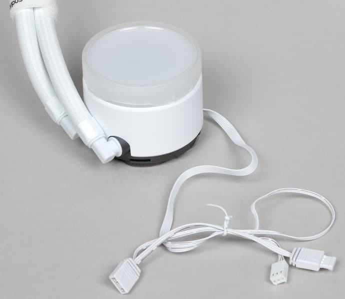 Длина кабеля питания от помпы — 42 см, кабеля подсветки — 50 см плюс 10 см до проходного разъема, на большей части длины они объединены воедино, причем такая же схема используется и для удлинителя, которым подключаются вентиляторы. Шланги здесь немного короче обычного — 36 см по гибкой части без учета обжимных гильз. Шланги упругие, но относительно гибкие, они заключены в оплетку из скользкого пластика, внешний диаметр шлангов с оплеткой 12,5 мм. Г-образные фитинги на входе в помпу поворачиваются, что облегчает установку системы. В комплект поставки входят две тканевых стяжки с липучкой, с помощью которых можно зафиксировать шланги и придать системе более опрятный вид.