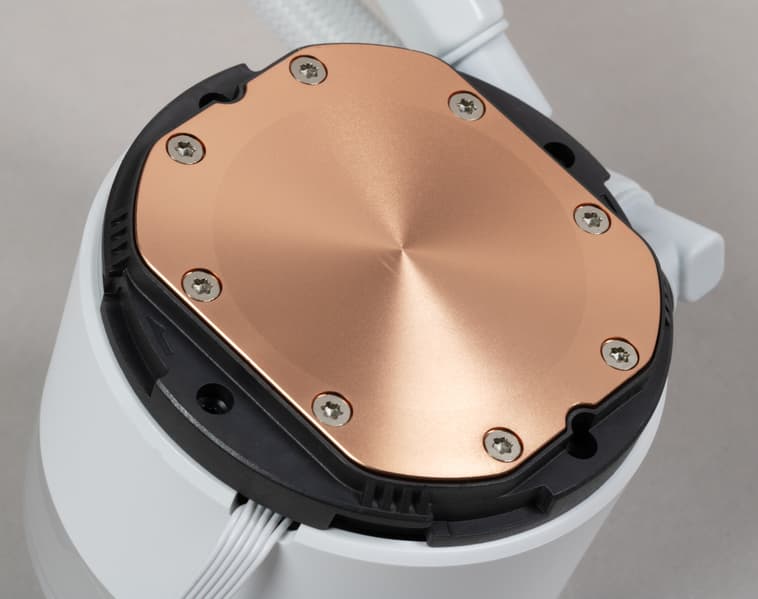 Система герметичная, заправлена, готова к использованию — даже вентиляторы уже установлены на посадочные места. Помпа интегрирована в один блок с теплосъемником. Подошвой теплосъемника, непосредственно прилегающей к крышке процессора, служит медная пластина. Ее внешняя поверхность ровная, шлифованная и слегка полированная. К центру она выпуклая с перепадом порядка 0,2-0,3 мм.