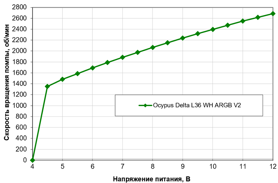Скоростью вращения помпы можно управлять только при помощи напряжения, зато делать это получается в широком диапазоне — почти монотонный график до 4,5 В, ниже чего помпа отключается. При этом во всем рабочем диапазоне обороты составляют не менее половины от максимальных — что считается важным для долговременной надежной работы помп с гидродинамическим подшипником.