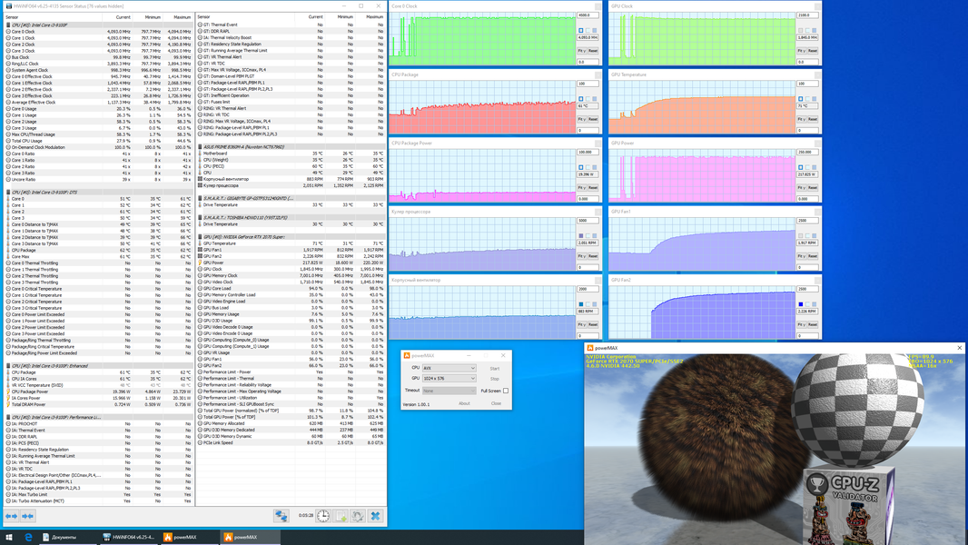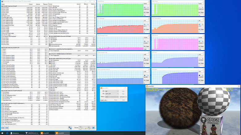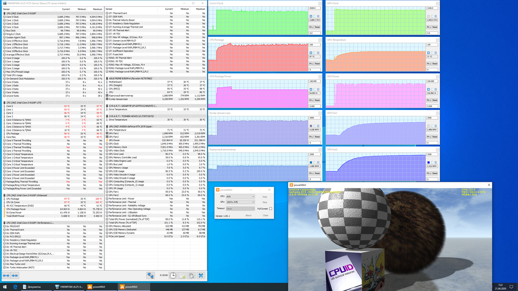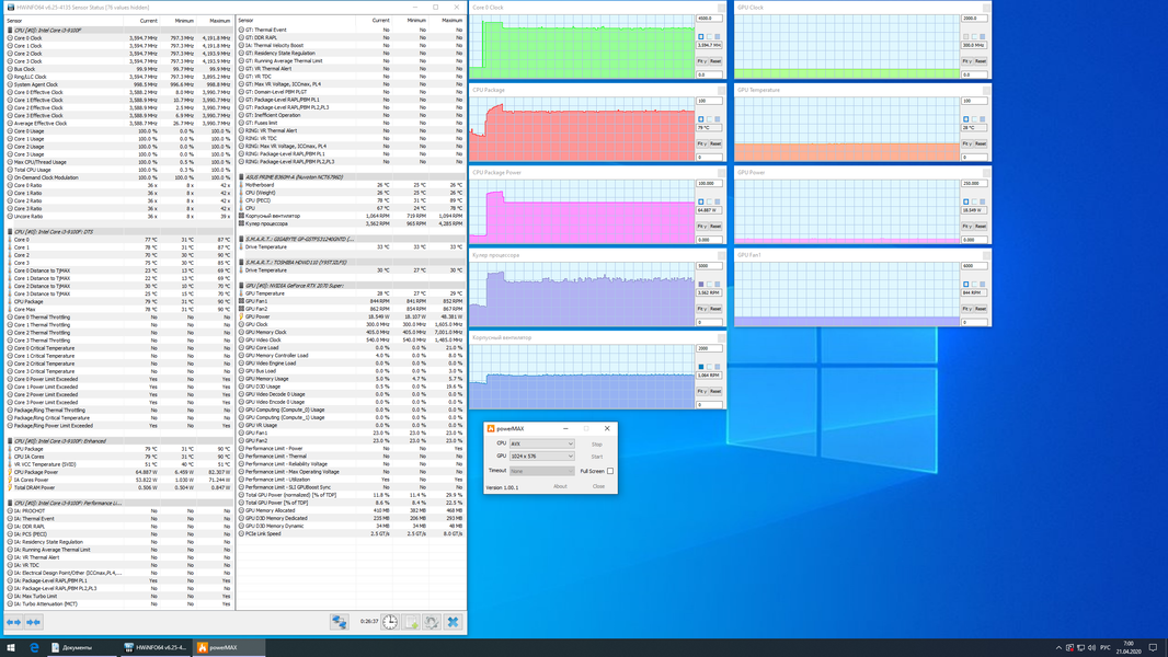 При одновременной стрессовой загрузке процессора и видеокарты выяснилось, что процессорный кулер «не тянет». Хотя он сразу же вышел на максимальный режим (4300 об/мин), а задний корпусный вентилятор прибавил еще немного и вращался на 1100 об/мин, приемлемо охлаждать процессор не получалось, тот быстро добрался до 100 °C в режиме Turbo Boost (при максимальном потреблении около 75 Вт), включился тротлинг. Однако и при снижении потребления до 65 Вт процессор лишь получил небольшую передышку: совсем скоро при повышении температуры воздуха в корпусе температура ядер снова начала подбираться к 100 °C, периодически одно ядро кратковременно тротлилось. Странно, что частота ядер при этом не опустилась с 4,0 до 3,6 ГГц, а упорно оставалась на 3,7 ГГц. Видеокарту все эти проблемы не затронули, она работала с теми же частотами, потреблением и нагревом, разве что максимальная частота вентиляторов оказалась чуть выше: 2050/2400 об/мин. Энергопотребление системы под стрессовой нагрузкой в пике доходило до 370 Вт, в установившемся режиме составляло 350 Вт. Шум оказался ограничен тем же уровнем 45 дБА, что и при максимальной нагрузке только на процессор, потому что самым громким элементом системы охлаждения компьютера является работающий в максимальном режиме кулер процессора.