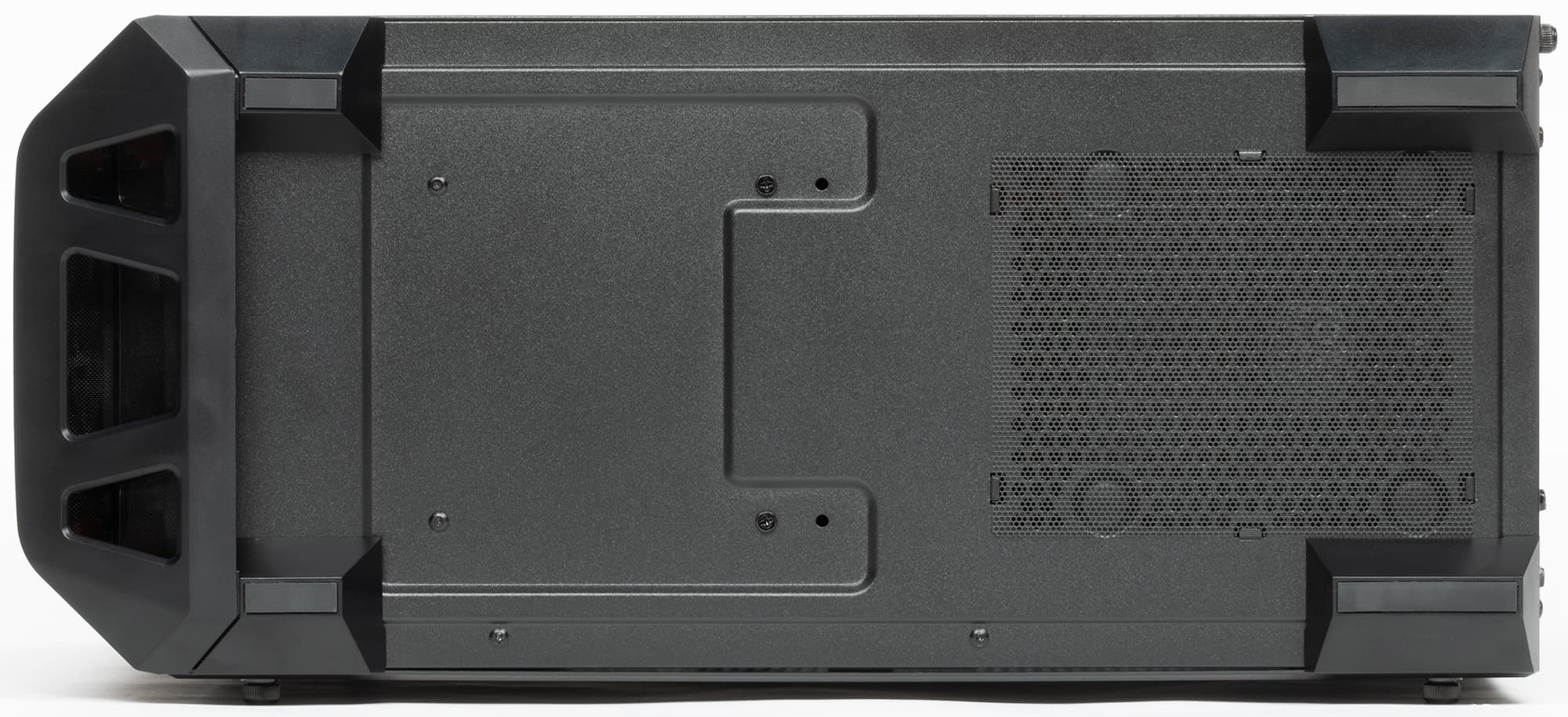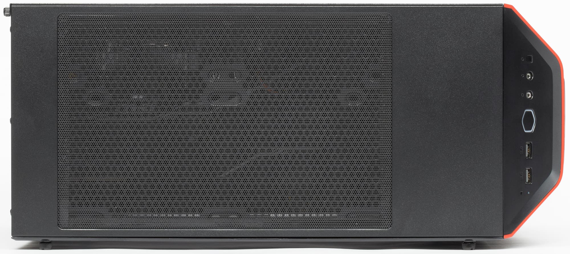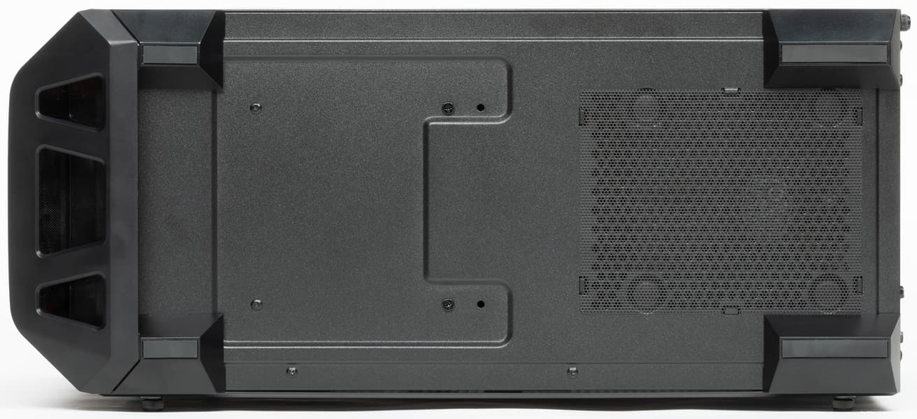 У корпуса симпатичная передняя панель, выступающая горбом, центральная часть этого выступа формируется очень мелкой металлической сеткой, а по бокам есть небольшие пазухи, прикрытые мелкой пластиковой сеткой. За этим горбом можно установить по-настоящему мощные приточные вентиляторы во всю высоту передней панели (3×120 мм или 2×140 мм), и им действительно будет что прокачивать. Впуски оформлены цветными пластиковыми элементами, в нашем случае они были красные. В паре с такой же полоской, которая оформляет скос у верхней грани, получается ненавязчивый цветной акцент. Оборотной стороной проницаемой передней панели является отсутствие звукоизоляции, причем шуметь передние вентиляторы будут прямо в ухо пользователю.
