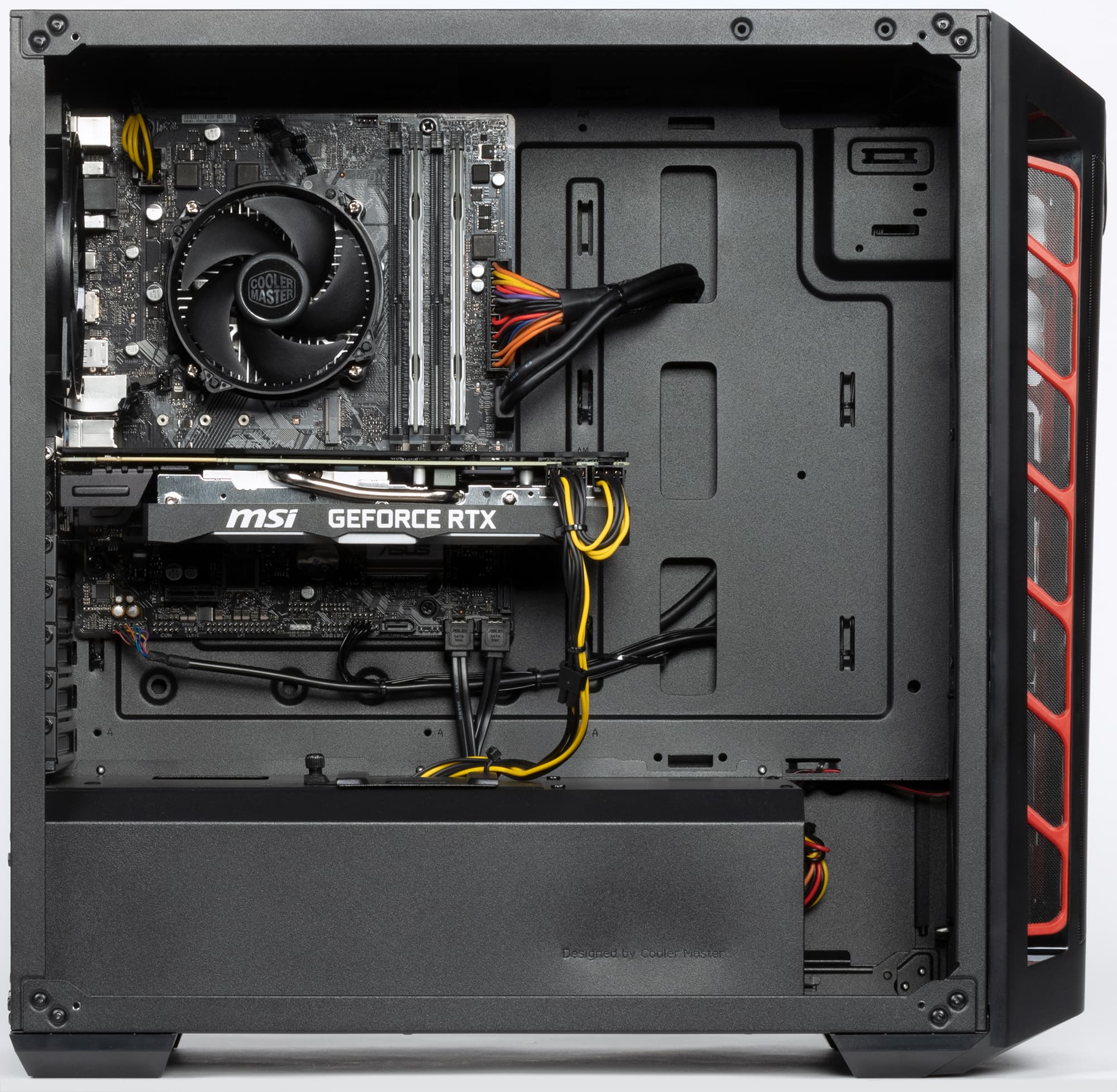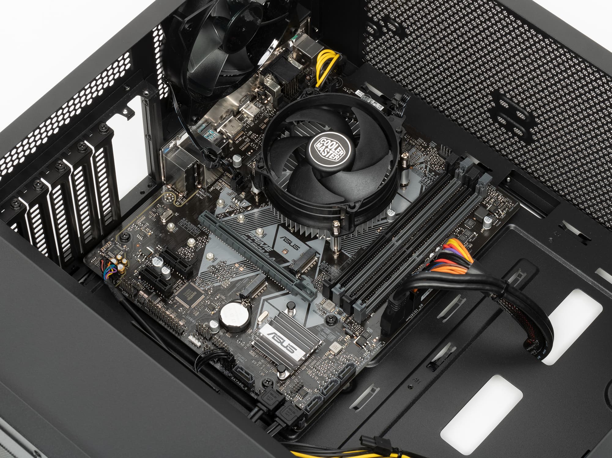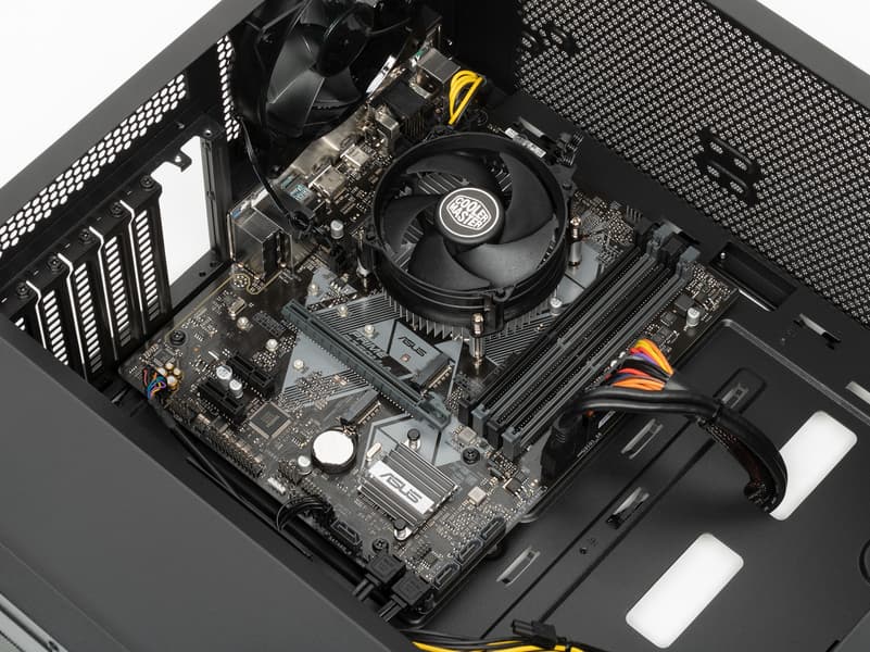 Сам по себе Core i3-9100F — недорогой 4-ядерный процессор с базовой частотой 3,6 ГГц и турбо-частотой 4,2 ГГц. Он имеет умеренный TDP 65 Вт, и охлаждать его в данном случае призван скромный кулер CoolerMaster X Dream P115. Это почти стандартный алюминиевый боксовый кулер, низкопрофильный, но в данном случае он явно выбран за свою цену, потому что места для установки в корпусе высокого кулера — с избытком.