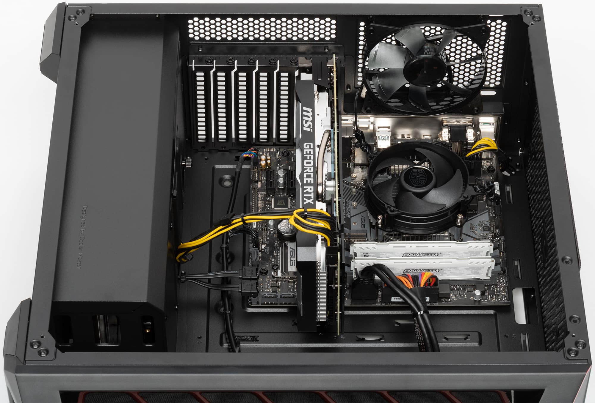 Внутри корпус условно разделен на два объема. Нижний объем, в котором устанавливаются БП и отсек для накопителей, закрыт сплошным кожухом, но все-таки в нем есть отверстия для удобства установки комплектующих и прокладки проводов, так что по-настоящему изолированным его назвать нельзя. Зато уж кабели здесь есть где уложить аккуратно, и сборка нас не разочаровала, все сделано на совесть.