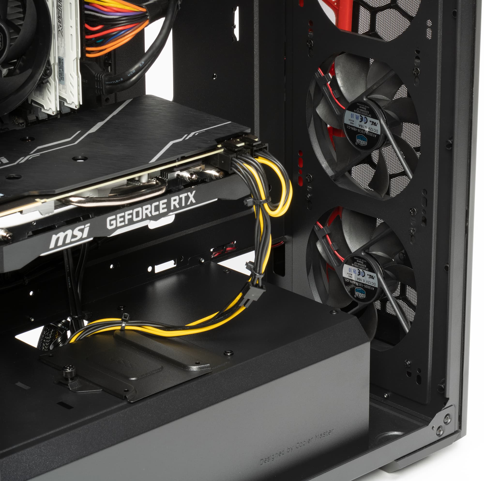 Штатным у корпуса является только задний 120-миллиметровый вентилятор (разумеется, производства CoolerMaster), в данном случае в Ого! дополнительно установили два 120-миллиметровых вентилятора (CoolerMaster же) спереди. Вообще, корпус предлагает гораздо более широкие возможности для размещения систем охлаждения, как минимум можно установить еще один вентилятор 120 мм спереди и два 120/140 мм сверху (аналогично могут быть установлены радиаторы водянок). Передние вентиляторы не предусматривают регулировки своей работы, они подключаются лишь к периферийным разъемам блока питания. Задний вентилятор подключен к стандартному 3-контактному разъему на материнской плате, его работой можно управлять программно.