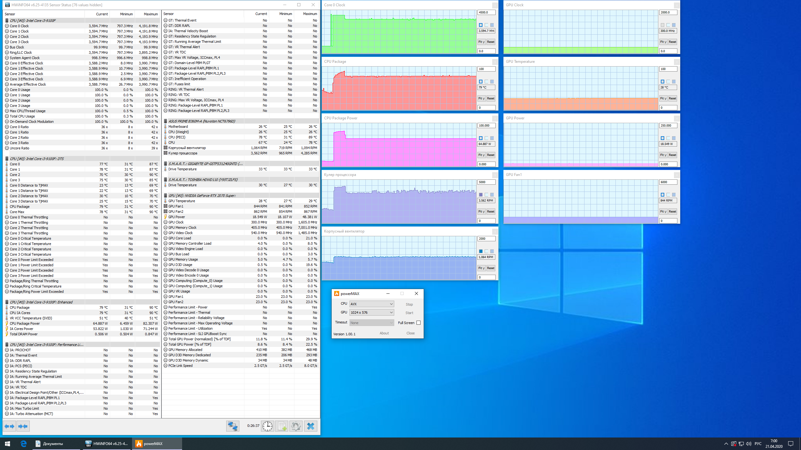 При стрессовой загрузке процессора (мы использовали утилиту powerMax) процессор некоторое время работает в режиме Turbo Boost на повышенных до 4,0 ГГц частотах при потреблении 82 Вт. Его температура быстро растет, несмотря на раскручивающийся почти сразу же до максимальных оборотов (4300 об/мин согласно программе диагностики) вентилятор кулера, и доходит до 90 °C. После этого процессор возвращается к штатным частотам 3,6 ГГц при штатном потреблении 65 Вт, его температура вскоре стабилизируется на 79 °C, кулер снижает обороты вентилятора примерно до 3800 об/мин. Задний корпусный вентилятор сразу же после старта теста раскручивается до 1050 об/мин и стабильно работает в этом режиме. Потребление системы в пике достигает 130 Вт, в установившемся режиме составляет 105 Вт. Перегрева и тротлинга за время теста зафиксировано не было. Шум повышается до 45 дБА в пике и до 42,5 дБА после возврата процессора к штатному потреблению, это действительно громко.