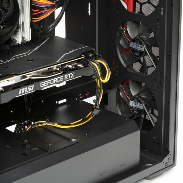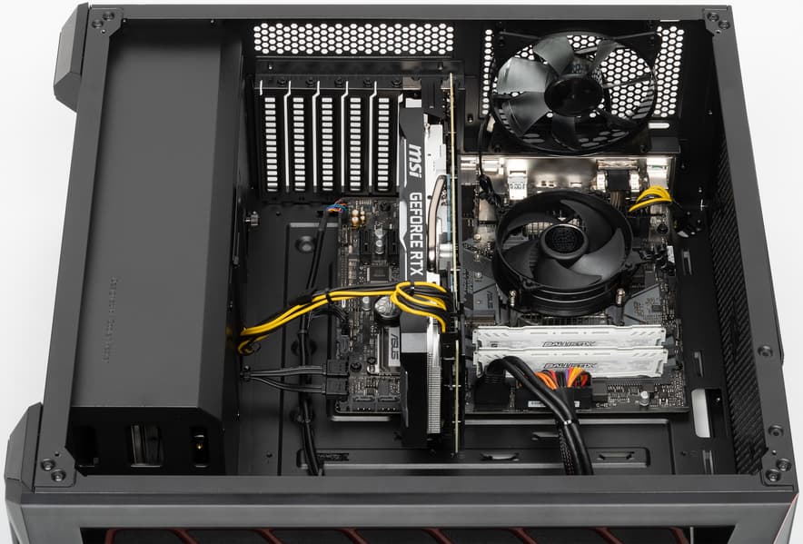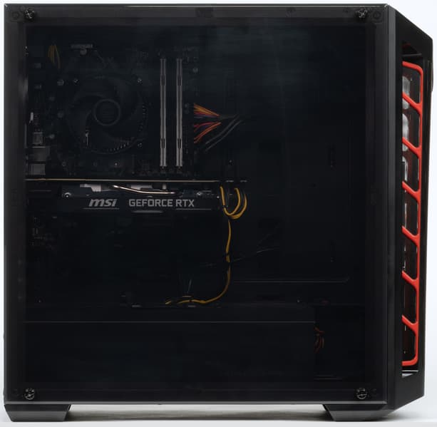 Процессор Core i3-9100F лишен встроенного видеоядра, и в данном случае это как никогда актуально, потому что в компьютере установлен мощный ускоритель Nvidia GeForce RTX 2070 Super производства MSI (GeForce RTX 2070 Super Ventus OC). У видеокарты совсем чуть-чуть (на 1%) повышены частоты относительно референсного ускорителя, так что производительность будет почти такая же. Опытный покупатель может попробовать самостоятельно разогнать GPU.