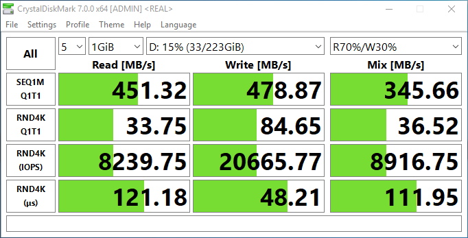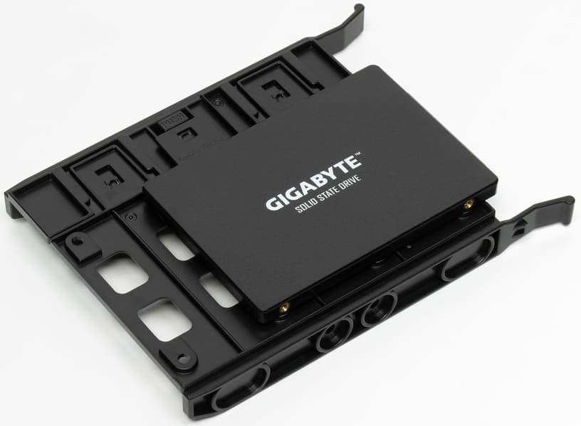 Дисковая подсистема представлена здесь оптимальным, наверное, сочетанием небольшого SSD и более емкого HDD. Старомодно выглядящий SSD-накопитель Gigabyte с интерфейсом SATA600 и в форм-факторе 2,5″ не блещет характеристиками (линейные чтение/запись: 450/480 МБ/с, 4K IOPS: 8K/21K) — впрочем, для SATA SSD они типичные.