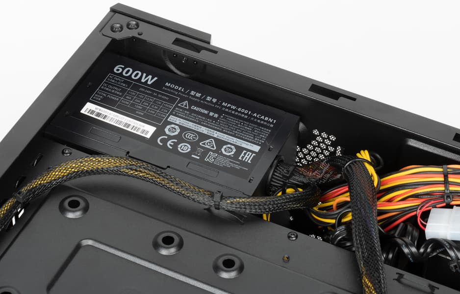 Питанием систему снабжает БП CoolerMaster Elite V3 мощностью 600 Вт. Этот блок питания не имеет сертификата 80 Plus, но для него заявлена эффективность 82% «в типичных условиях». БП рассчитан на 600 Вт, а у собранной системы максимальное потребление под нагрузкой — в районе 370 Вт. Таким образом, есть солидный запас по максимальной мощности, БП может работать тише и дольше выдавать более качественное напряжение.