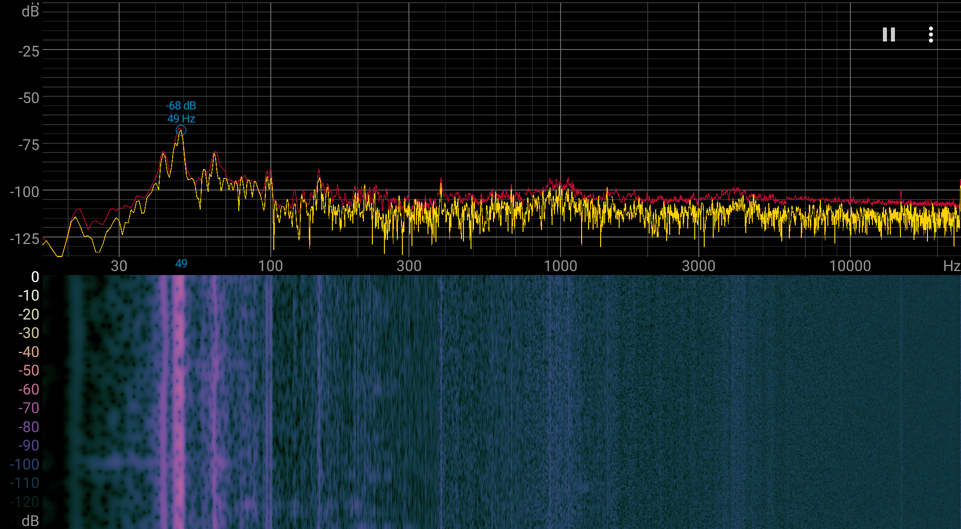 Если моноблок не нагружать совсем, то его система охлаждения всё равно работает в активном режиме, но услышать ее в типичном офисном помещении практически невозможно. Даже при большой нагрузке на процессор шум от системы охлаждения невысокий. Характер шума довольно ровный и раздражения не вызывает. Спектрограмма это подтверждает — в среднечастотной области пики есть, но интенсивность их невысокая, а пара низкочастотных пиков на самом деле проявляется в виде едва слышимого гудения: