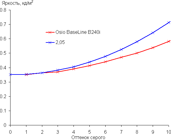 Рост прироста яркости на шкале серого в основном равномерный, и каждый следующий оттенок ярче предыдущего, за исключением трех пар темных оттенков. Впрочем, общей картины это не портит. В самой темной области аппаратно и визуально различаются почти все оттенки, кроме ближайшего к черному:
