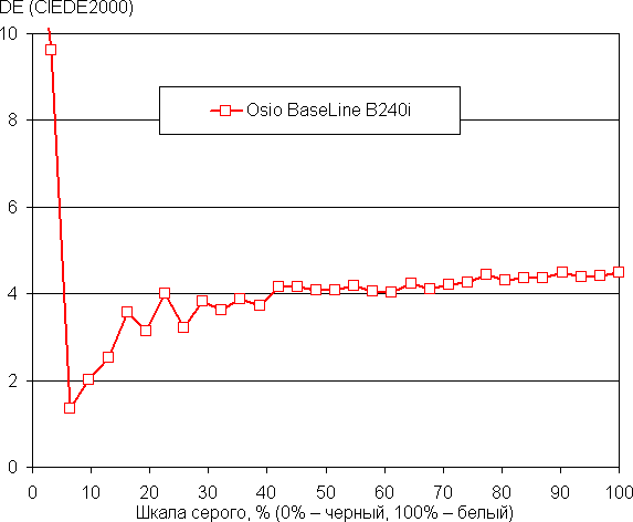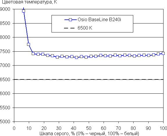 Баланс оттенков на шкале серого хороший, так как цветовая температура не сильно выше стандартных 6500 К, и отклонение от спектра абсолютно черного тела (ΔE) ниже 10, что для потребительского устройства считается приемлемым показателем. При этом цветовая температура и ΔE мало изменяются от оттенка к оттенку — это положительно сказывается на визуальной оценке цветового баланса. (Самые темные области шкалы серого можно не учитывать, так как там баланс цветов не имеет большого значения, да и погрешность измерений цветовых характеристик на низкой яркости большая.)