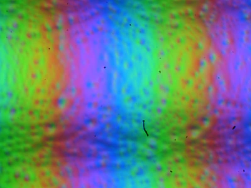 Зерно этих дефектов в несколько раз меньше размеров субпикселей (масштаб этих двух фотографий примерно одинаковый), поэтому фокусировка на микродефектах и «перескок» фокуса по субпикселям при изменении угла зрения выражены слабо, из-за этого нет и «кристаллического» эффекта.
