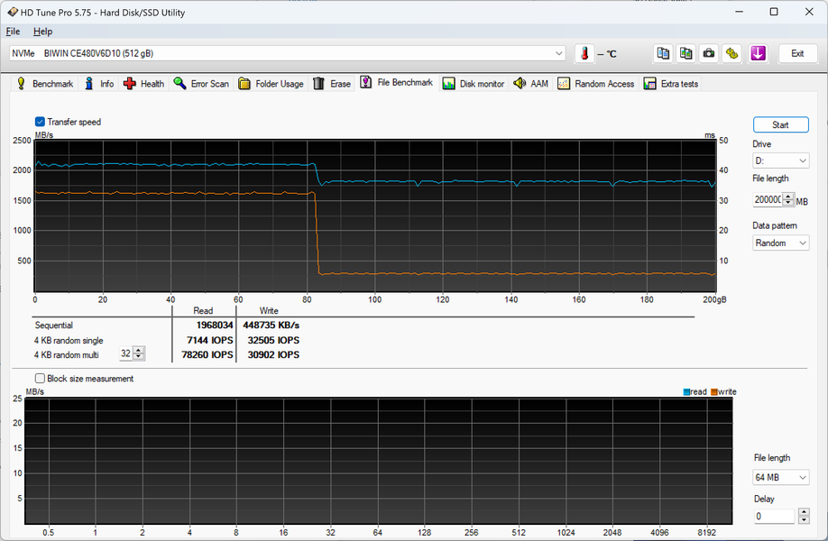 Что же касается SSD, то краткую оценку ему мы тоже дадим: 1777 баллов PCMark 10 Storage Full System Drive это уровень топовых SSD примерно пятилетней давности и вдвое выше лучших SATA-накопителей. Чего и достаточно. Ожидать подвохов тут не приходится — видим SLC-кэш примерно на 20% свободного места (мы воспользовались HD Tune, поскольку такой его режим работы не разрушающий — можно нормально тестировать и единственный накопитель в системе, чего обычно используемая AIDA64 не позволяет), а далее прямая запись в TLC-массив со скоростью чуть выше 300 МБ/с. И чтение информации на уровне 1,8-2,1 ГБ/с, что и ожидалось от этого контроллера при такой емкости. Очень многие OEM-накопители заметно хуже — даже когда на них есть заветный лейбл PCIe Gen4.