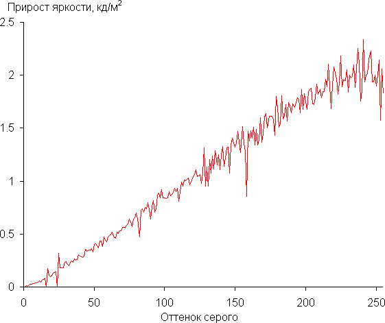 Далее мы измерили яркость 256 оттенков серого (от 0, 0, 0 до 255, 255, 255). График ниже показывает прирост (не абсолютное значение!) яркости между соседними полутонами: