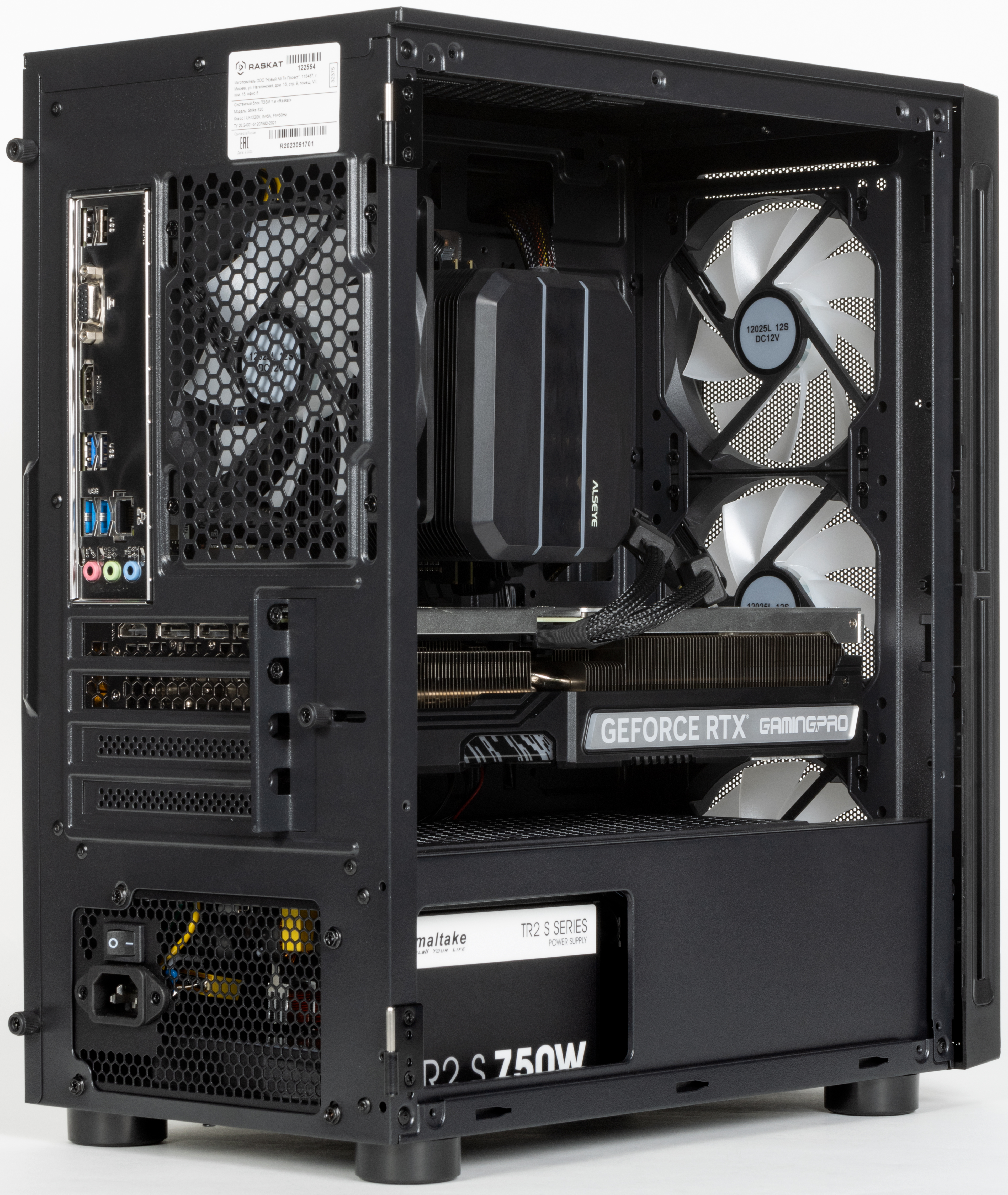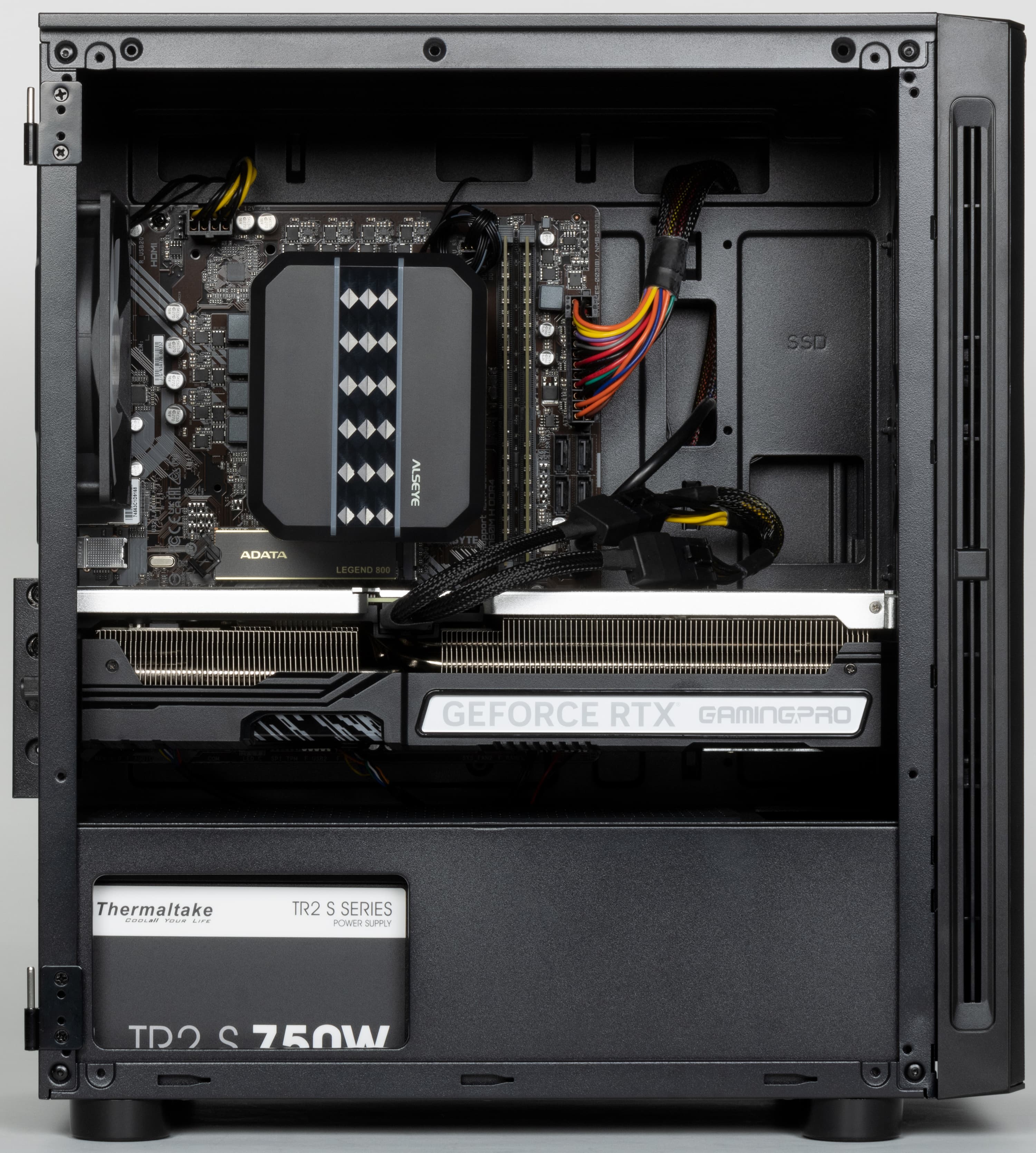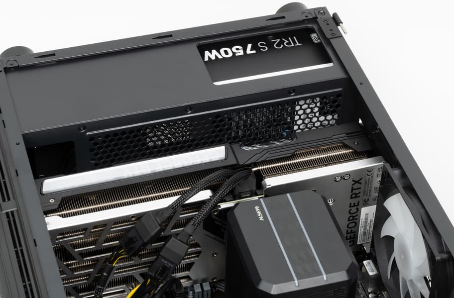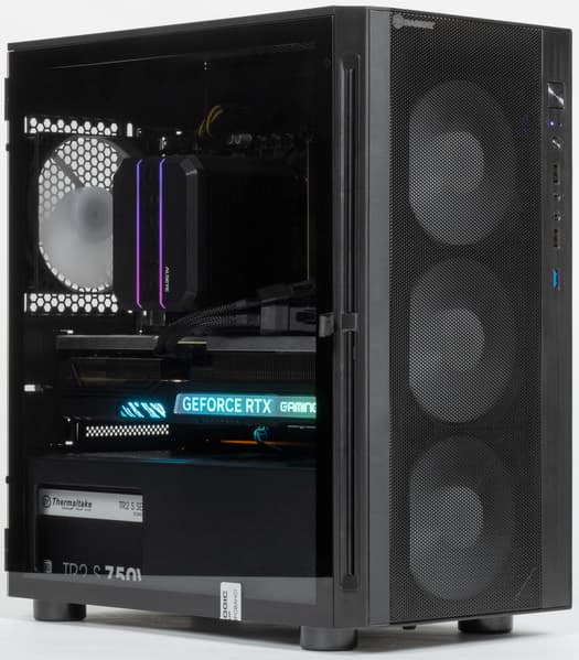 Блок питания Thermaltake TR2 S 750W имеет заметный запас мощности для данной конфигурации, но не факт, что им удастся воспользоваться. Дело в том, что, в отличие от многих блоков такой мощности, он снабжен лишь двумя разъемами питания видеокарт PCIe 2.0 (6+2), так что GeForce RTX 4070 Ti — пожалуй, максимум, который для него подходит. С другой стороны, вероятность замены видеокарты на что-то более прожорливого класса, как нам кажется, невелика. Особенно если говорить про покупателей готовых ПК, которые обычно гоняют их в хвост и в гриву до тех пор, пока идея модернизировать отдельные компоненты не потеряет смысл и не станет проще пойти и купить очередной готовый же компьютер.