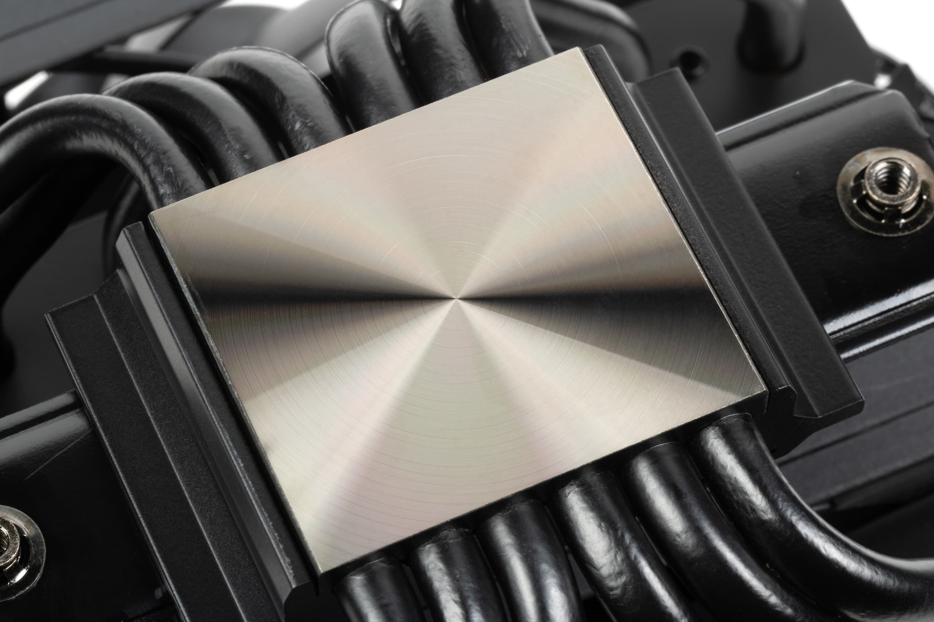 Верхняя часть теплосъемника изготовлена из алюминиевого сплава, нижняя представляет собой медную никелированную пластину размерами 35×40 мм. Трубки к теплосъемнику припаяны. Подошва теплосъемника имеет очень мелкую концентрическую проточку и слегка отполирована. Ее поверхность (как обычно) немного выпуклая к центру с перепадом порядка 0,1 мм. Преднанесенного термоинтерфейса нет, но производитель приложил к кулеру шприц с фирменной термопастой, коей несколько больше обычного (так что и на пару раз должно точно хватить).